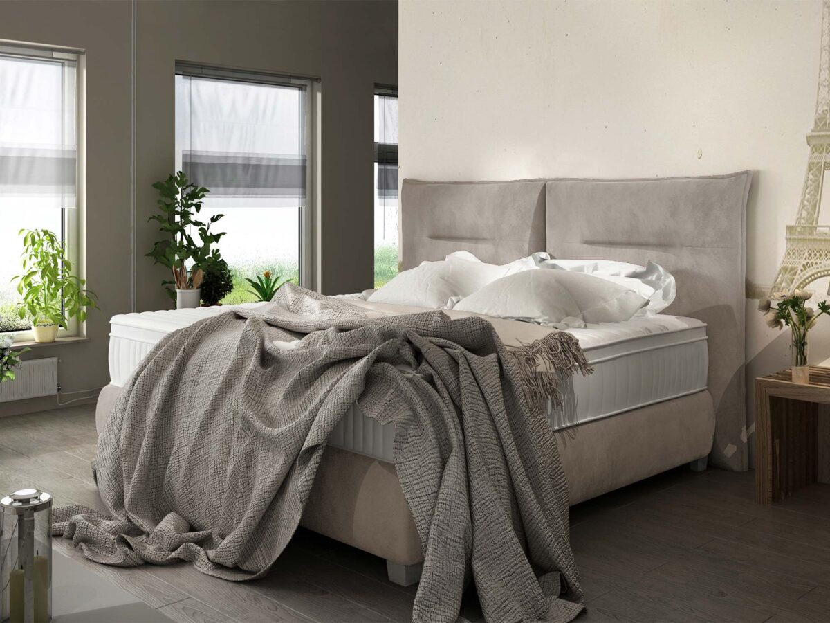 Beżowe łóżko kontynentalne z podwójnym zagłówkiem perspektywa