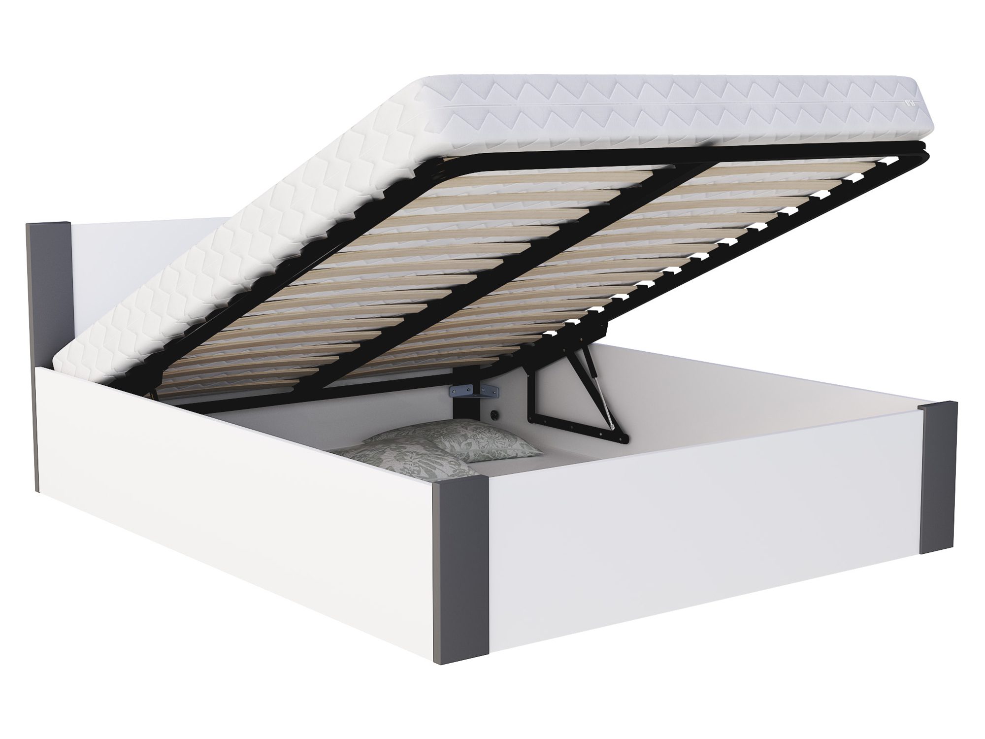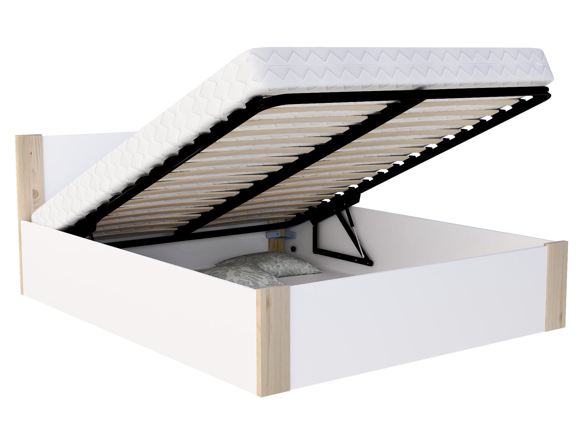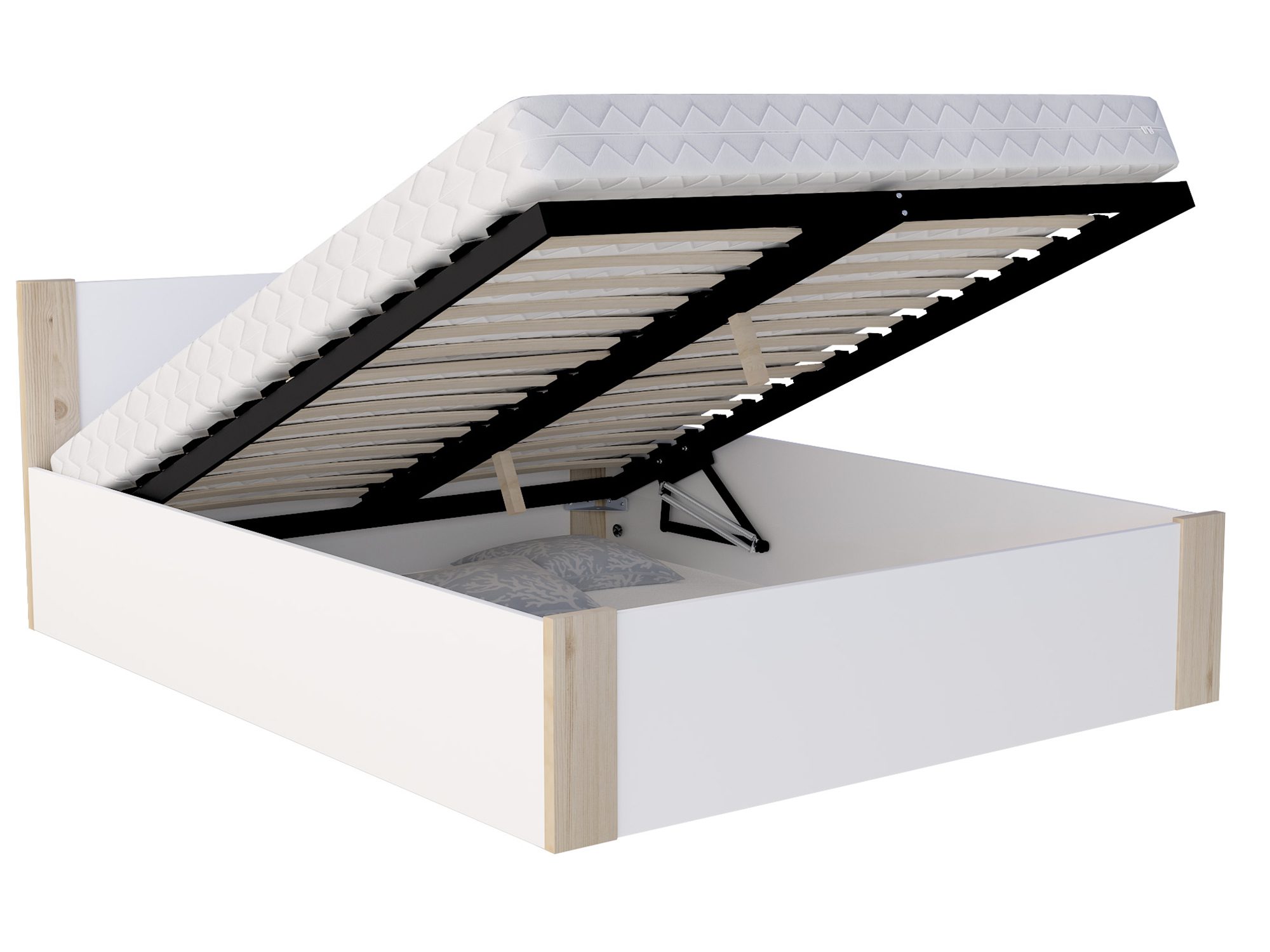 Wersja ze stelażem drewnianym to propozycja dla tych, którzy cenią prostotę i naturalne rozwiązania. Stabilna konstrukcja zapewnia komfort snu oraz trwałość przez długie lata. Z kolei wersja ze stelażem metalowym podnoszonym to idealna opcja, jeśli cenisz praktyczne wykorzystanie przestrzeni – dzięki wbudowanemu pojemnikowi zyskasz dodatkowe miejsce na pościel, koce czy sezonowe ubrania.