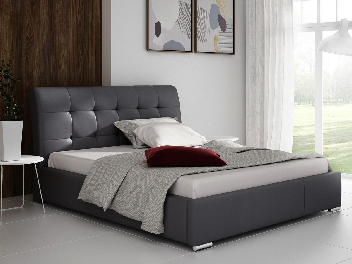 Grafitowe łóżko z pikowaniem – eleganckie, tapicerowane, miękka forma.