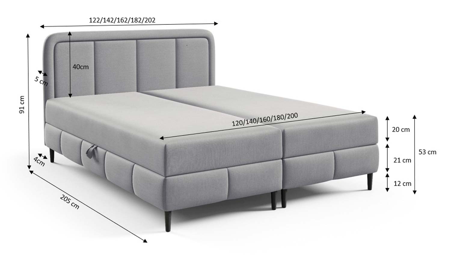 - Łóżko 200×200: Szer. 202 cm, Dł. 205 cm, Wys. powierzchni spania 57 cm, Waga: 125 kg