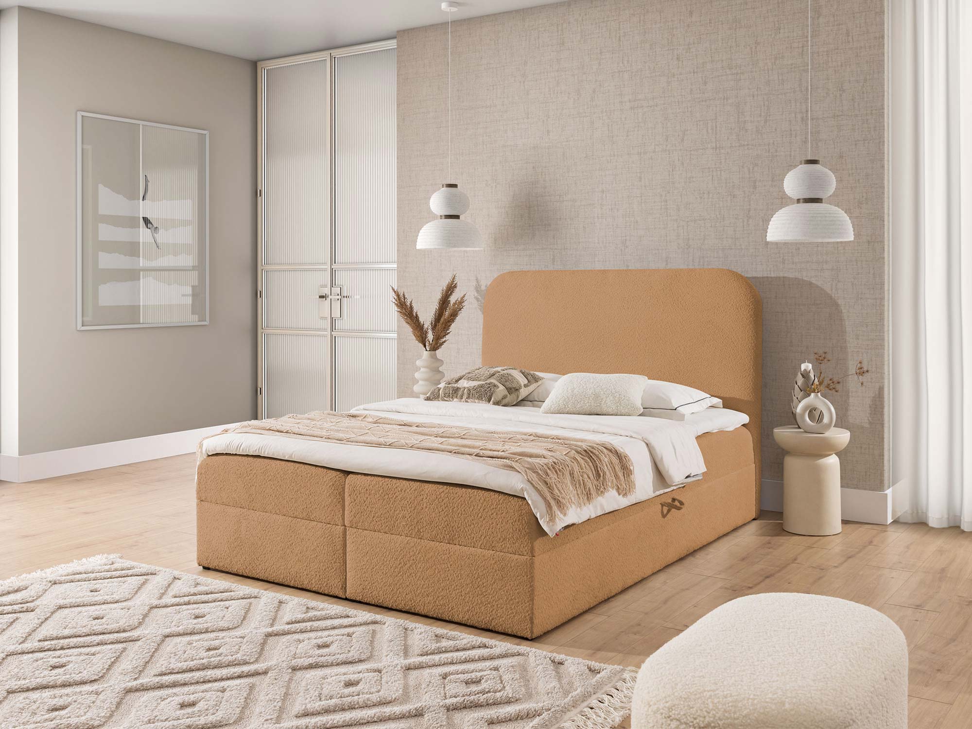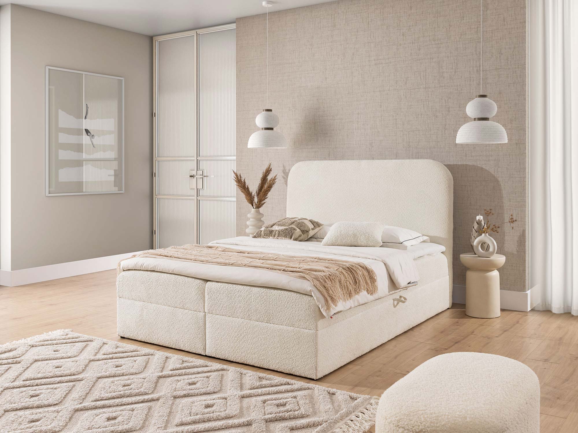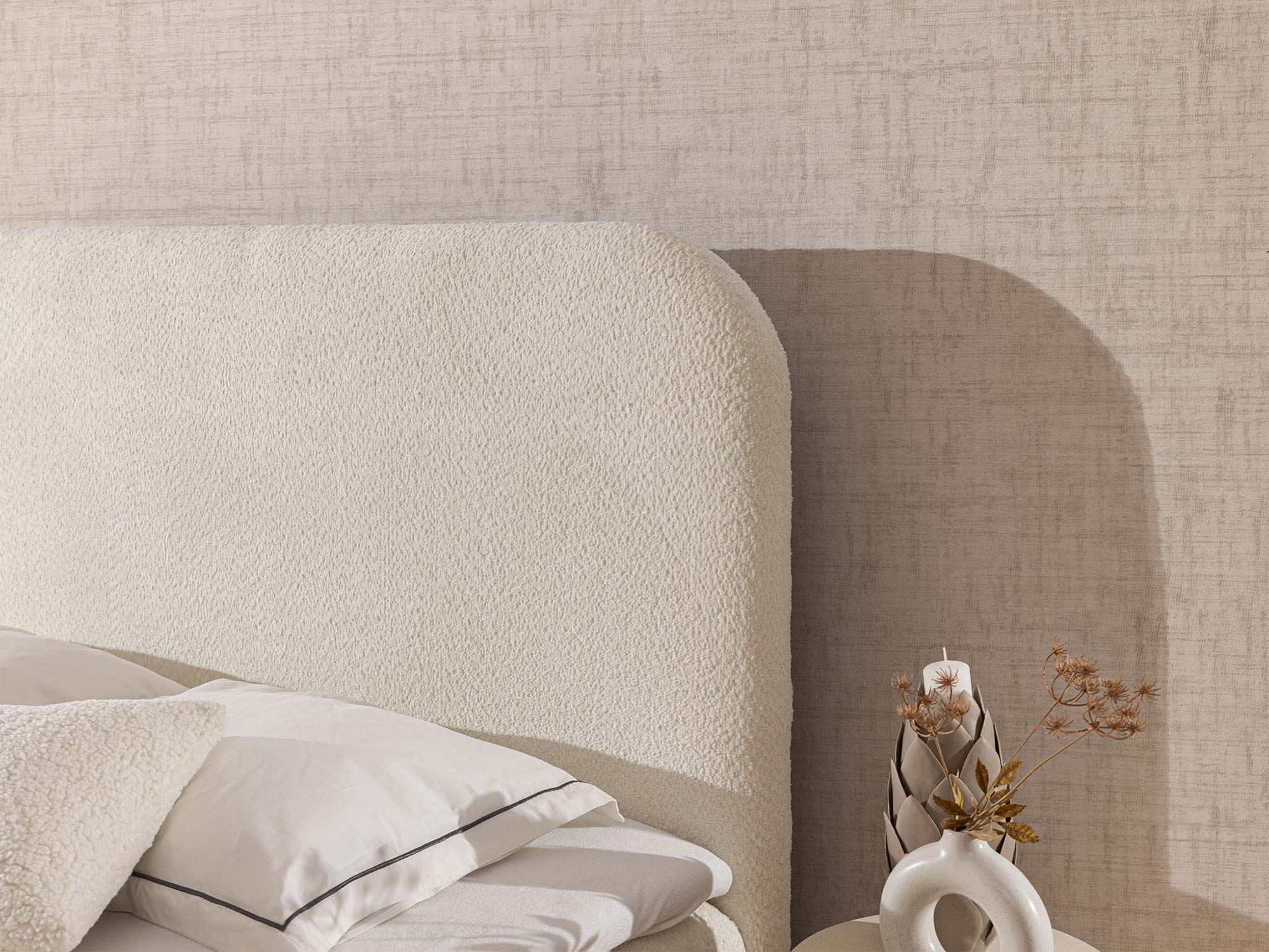 Detal zaokrąglonego zagłówka łóżka w tkaninie boucle