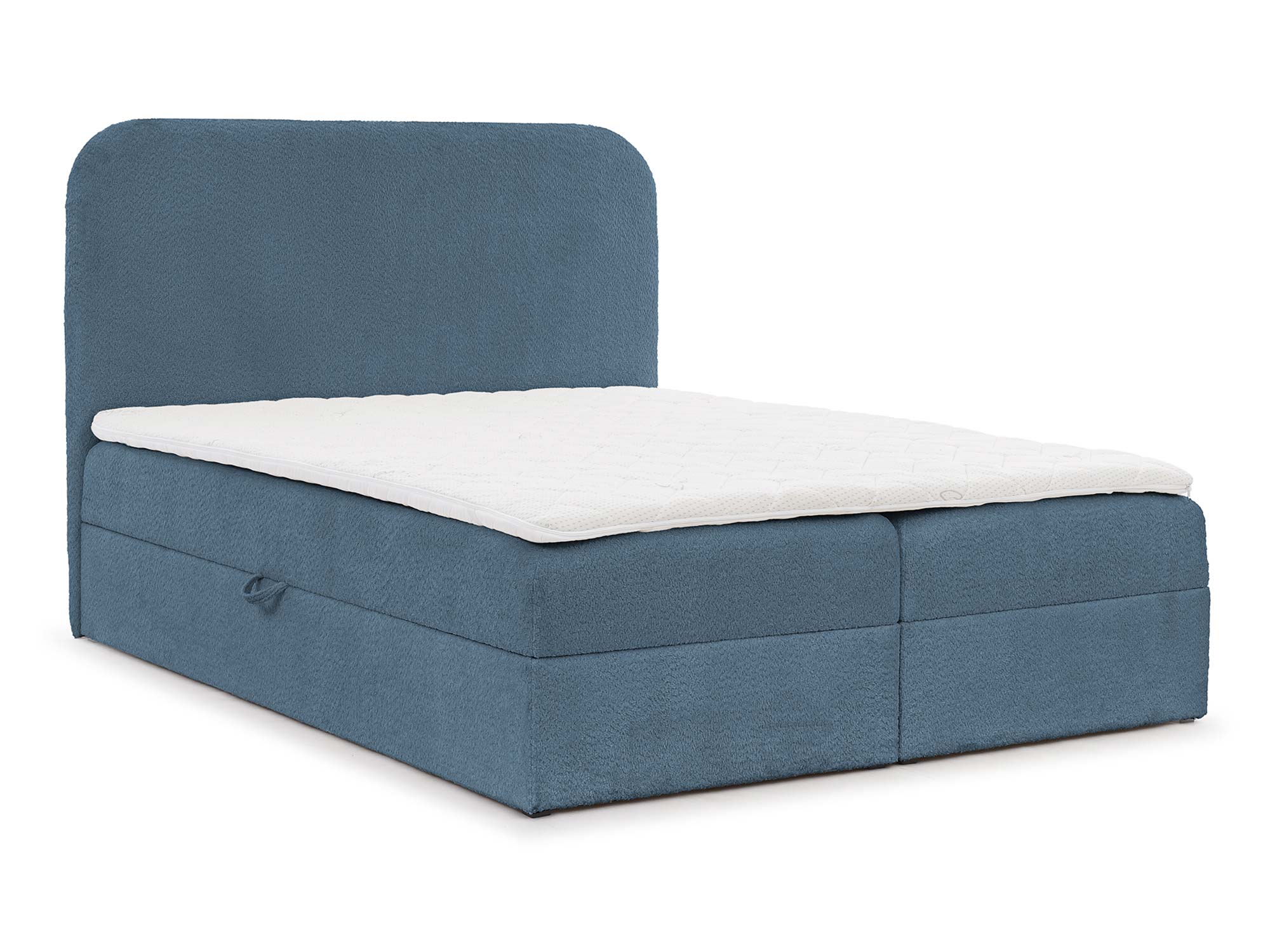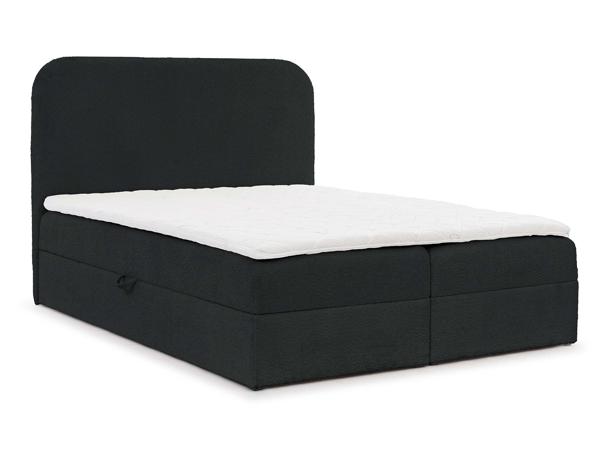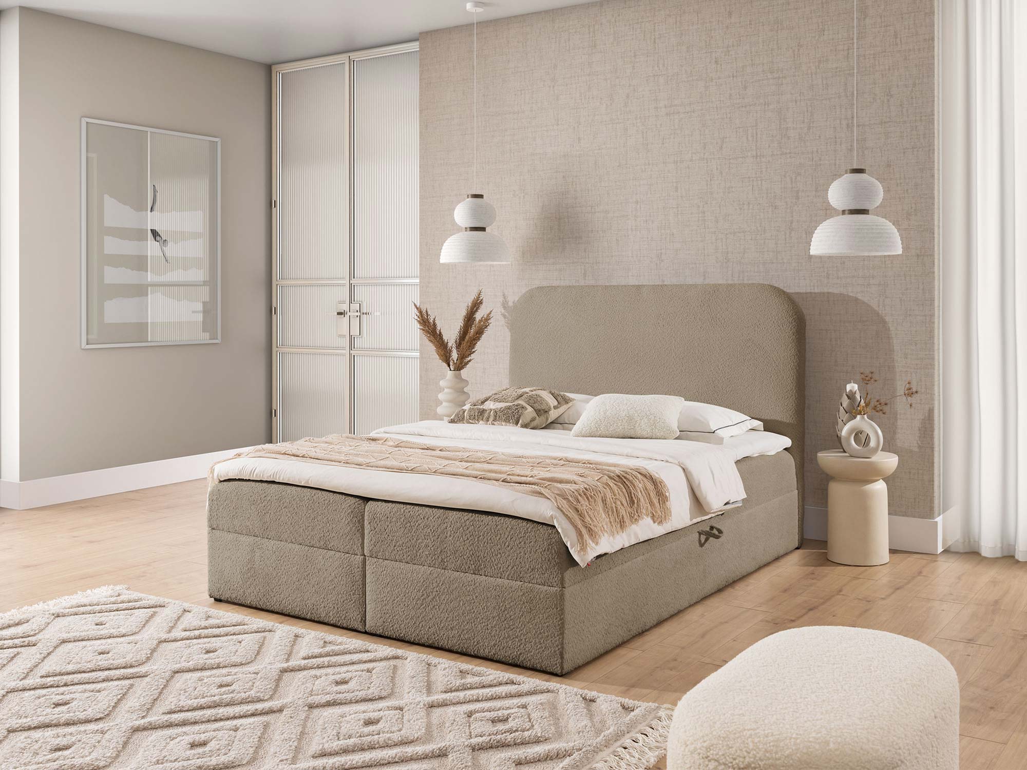 Detal zaokrąglonego zagłówka łóżka w tkaninie boucle