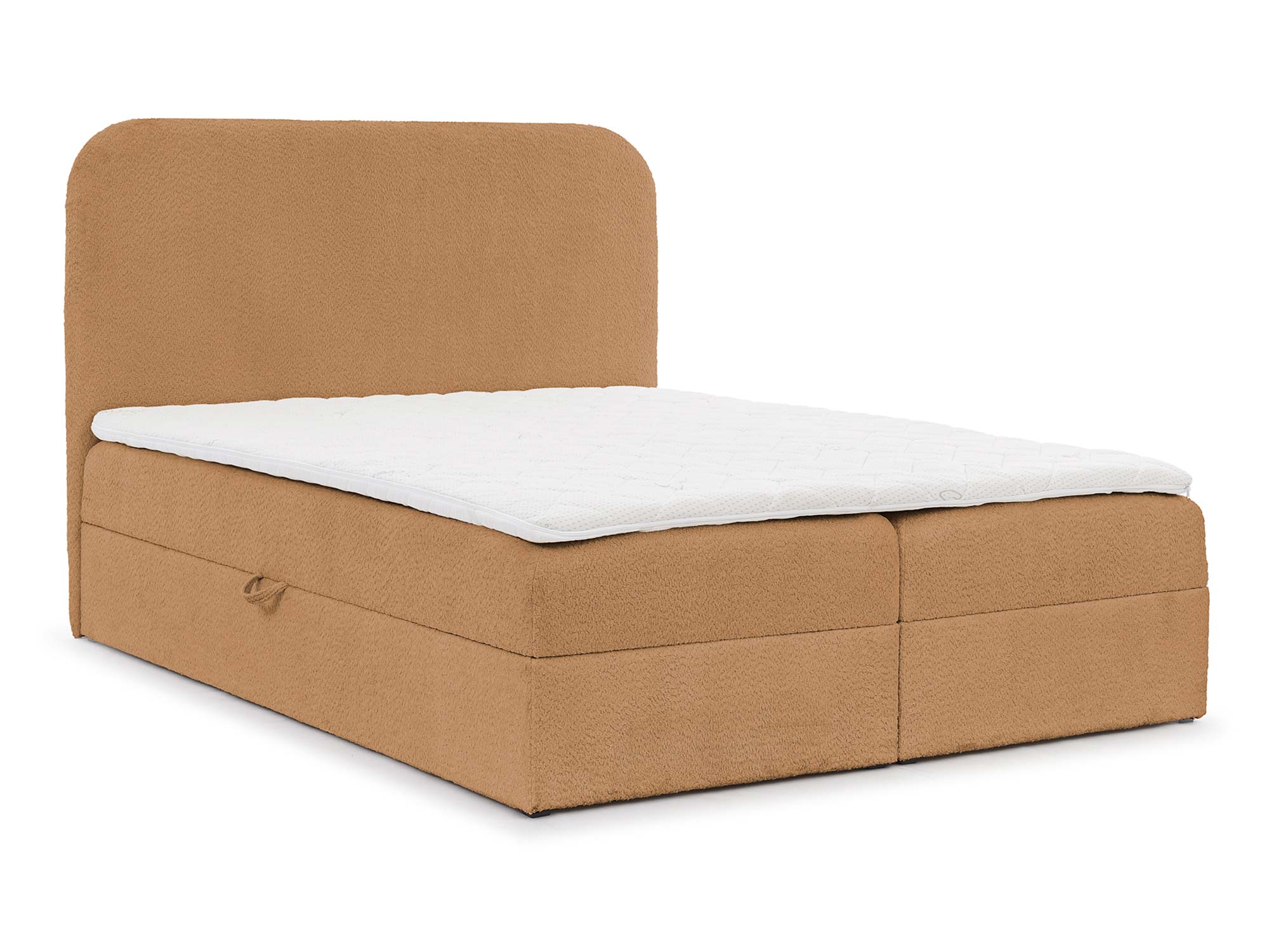 Kremowe łóżko z zaokrąglonym zagłówkiem i otwartym pojemnikiem