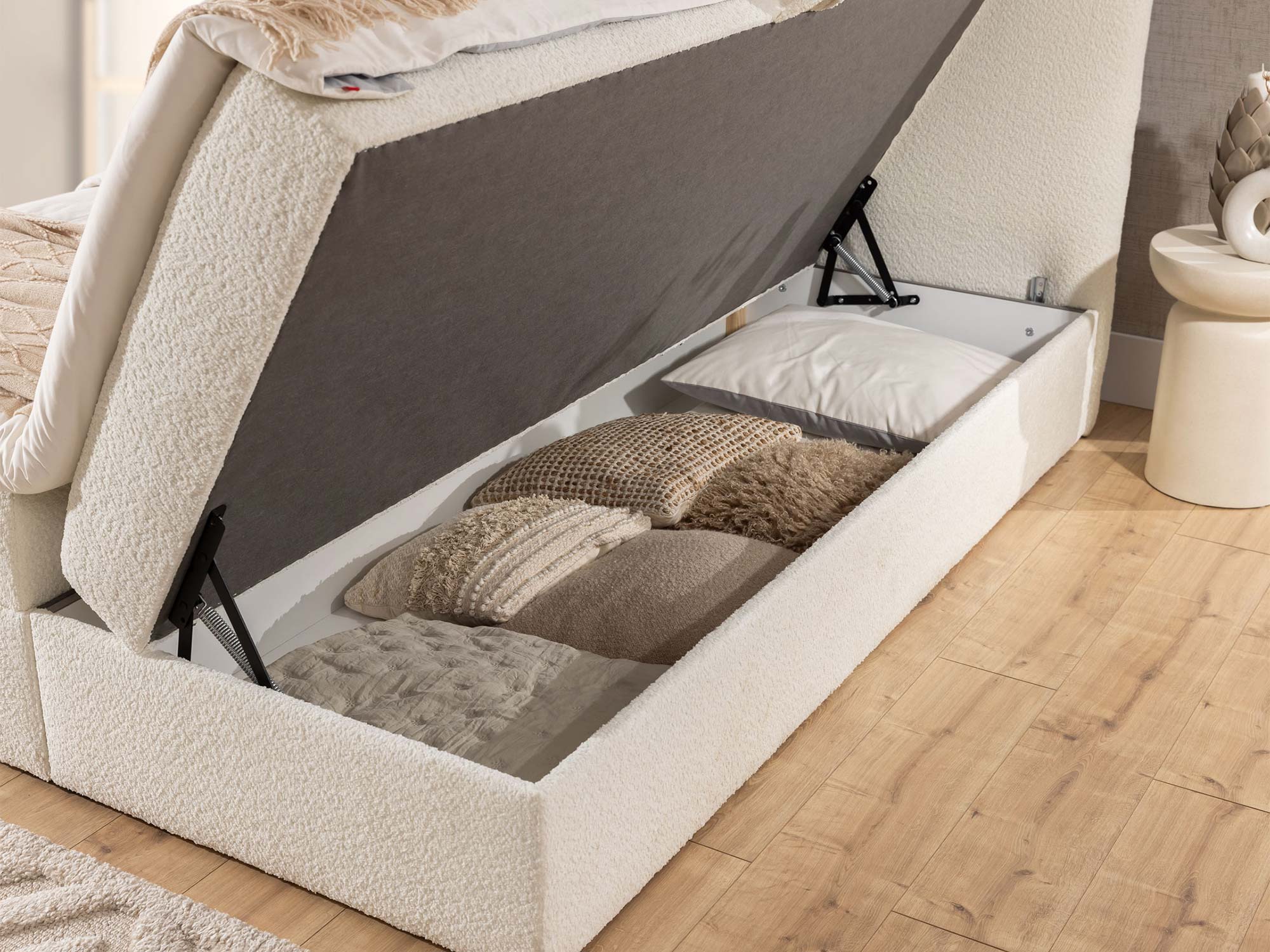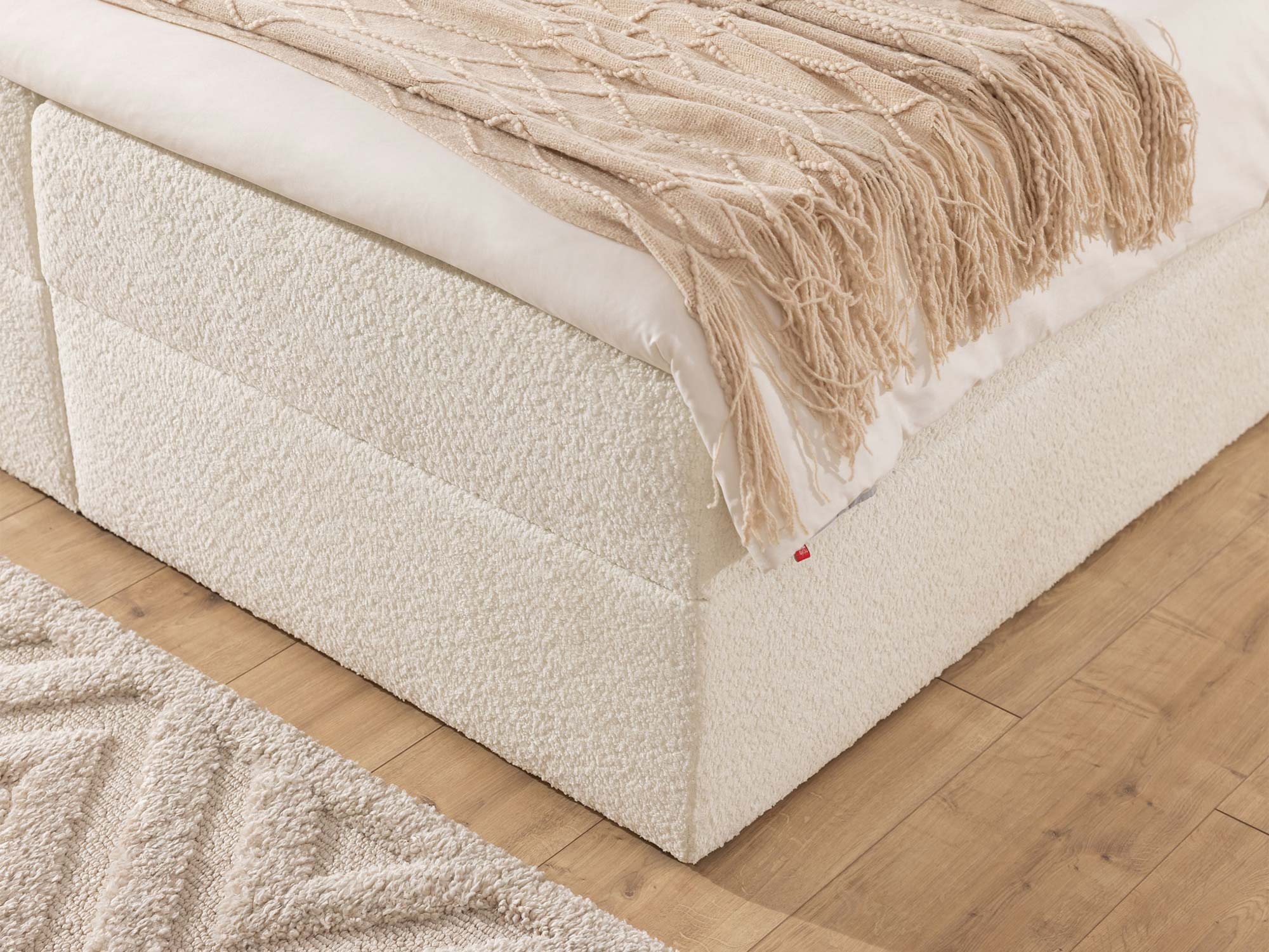 Detal kremowej podstawy łóżka tapicerowanego w boucle