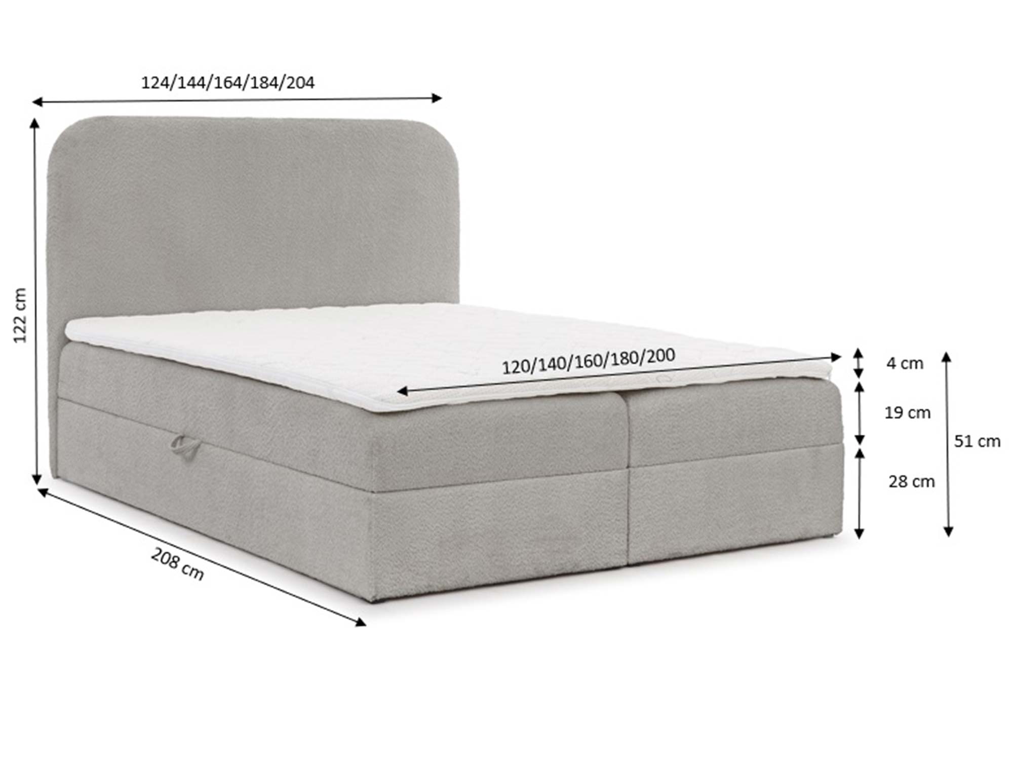 • Łóżko 180×200: wys. zagłowia 122 cm, szer. 184 cm, dł. 208 cm, wys. spania 51 cm, waga 125 kg