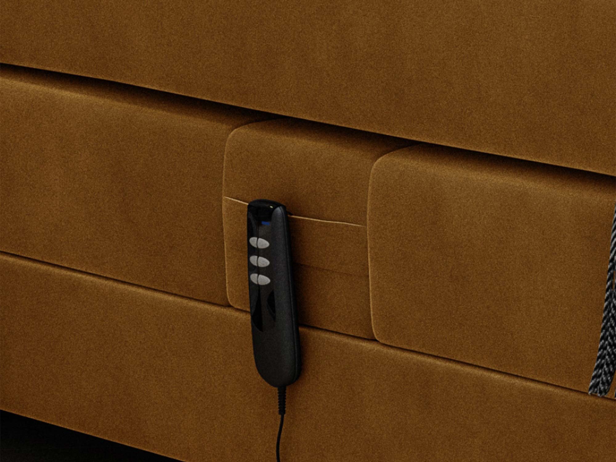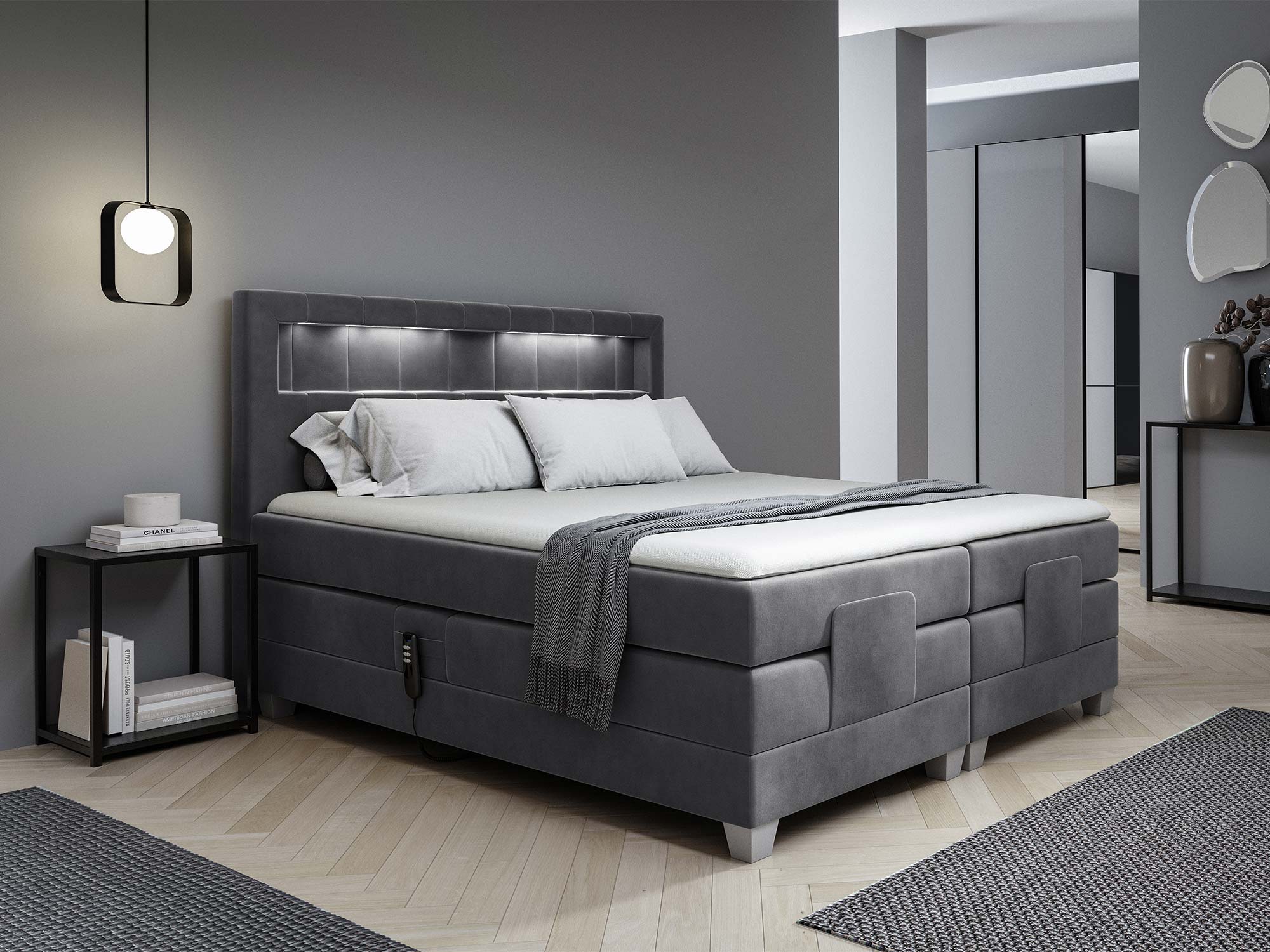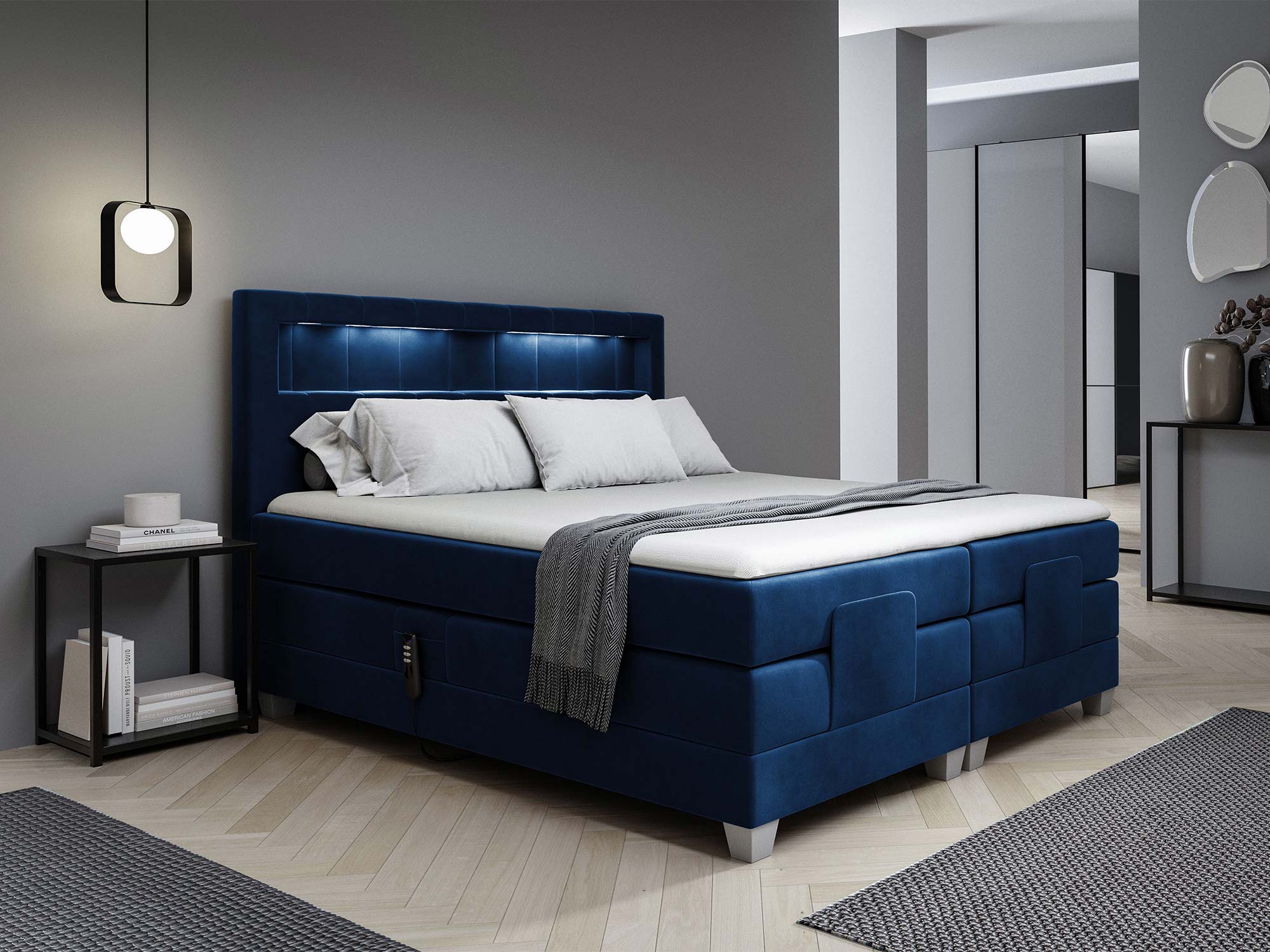 Największą innowacją jest wbudowane oświetlenie LED, sterowane wygodnym pilotem. Dzięki niemu możesz w kilka sekund stworzyć wyjątkowy nastrój – idealny do wieczornego relaksu, oglądania filmu czy czytania książki. Światło w barwie zimnej dodaje wnętrzu nowoczesnego charakteru i podkreśla geometryczne przeszycia zagłówka.