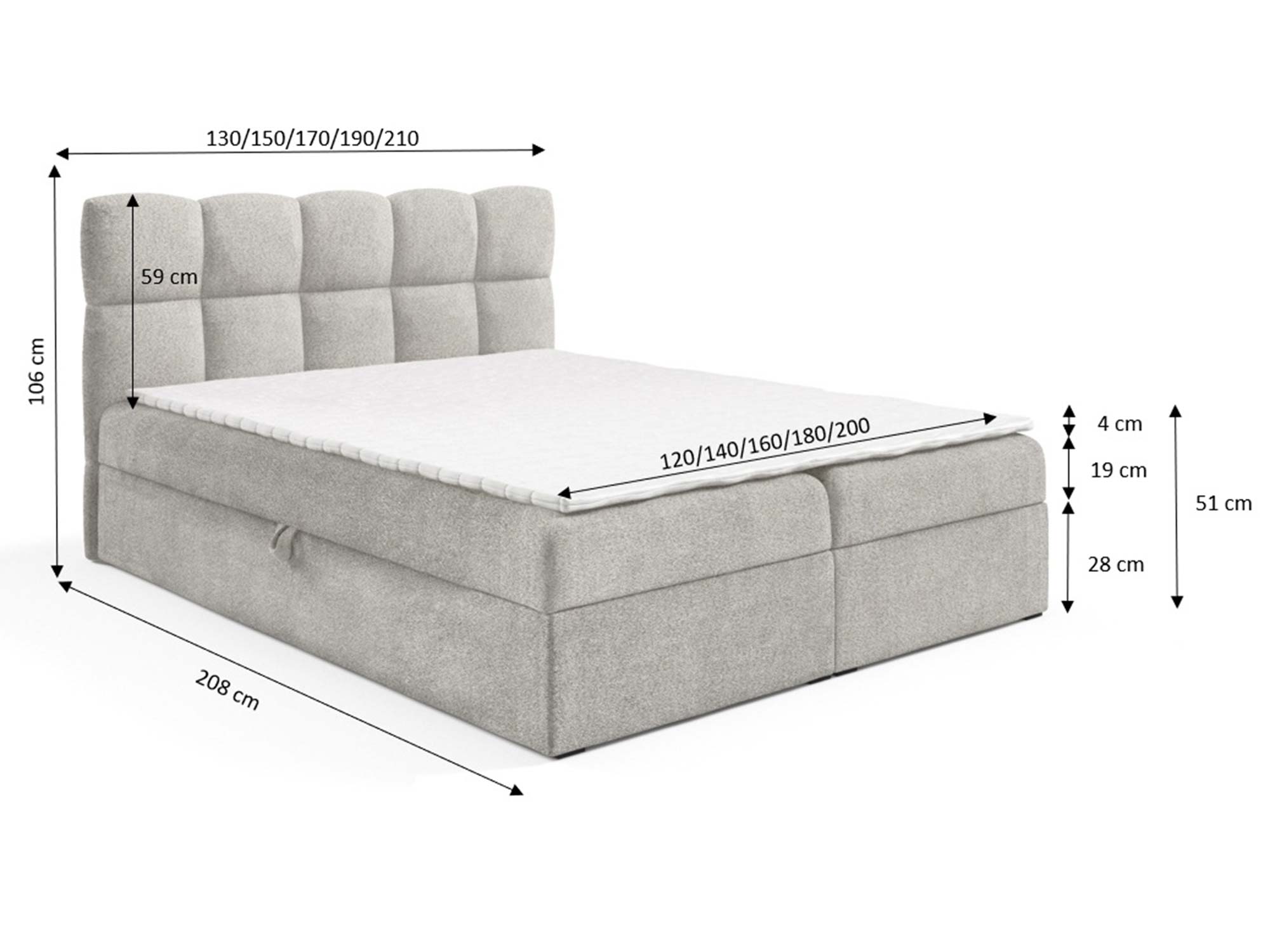 - Łóżko 200×200: wys. zagłowia 106 cm, szer. 210 cm, dł. 208 cm, wys. spania 51 cm, waga 131 kg
