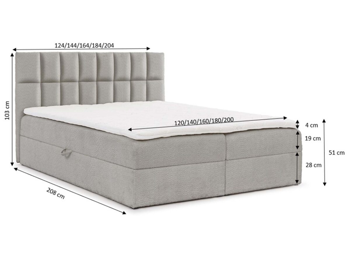 - Łóżko 140×200: wys. zagłowia 103 cm, szer. 144 cm, dł. 208 cm, wys. spania 51 cm, waga 109 kg