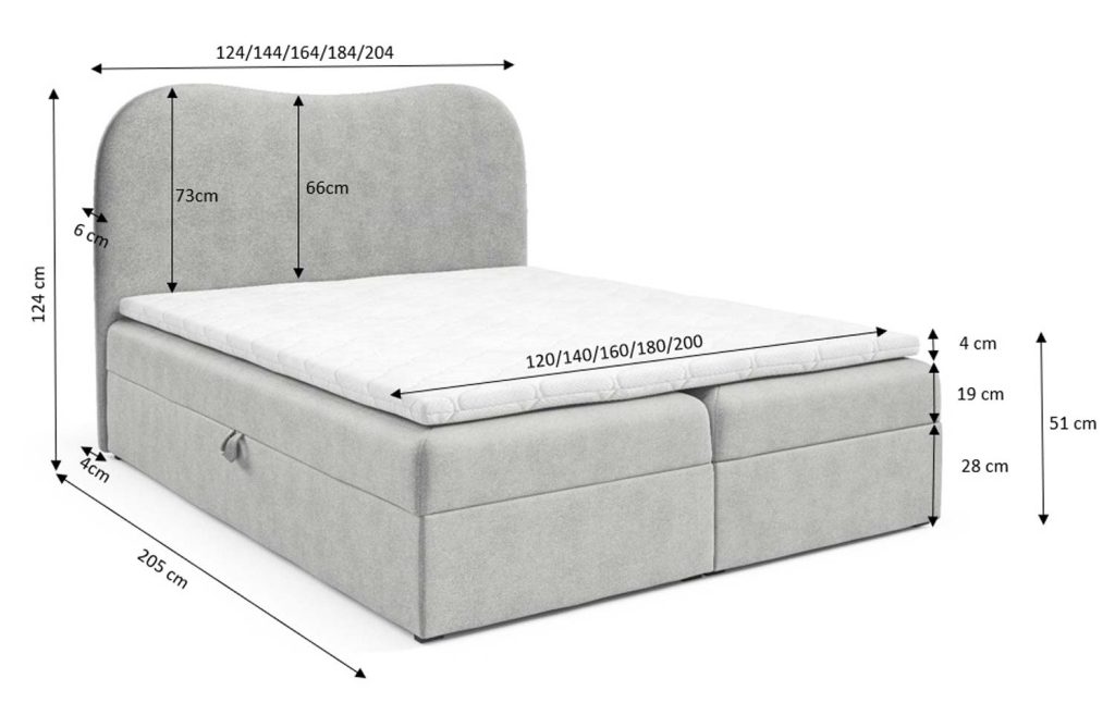 - Łóżko 160×200: Szer. 164 cm, Dł. 206 cm, Wys. zagłowia 117–124,5 cm, Pow. spania 52 cm, Waga: 130,5 kg