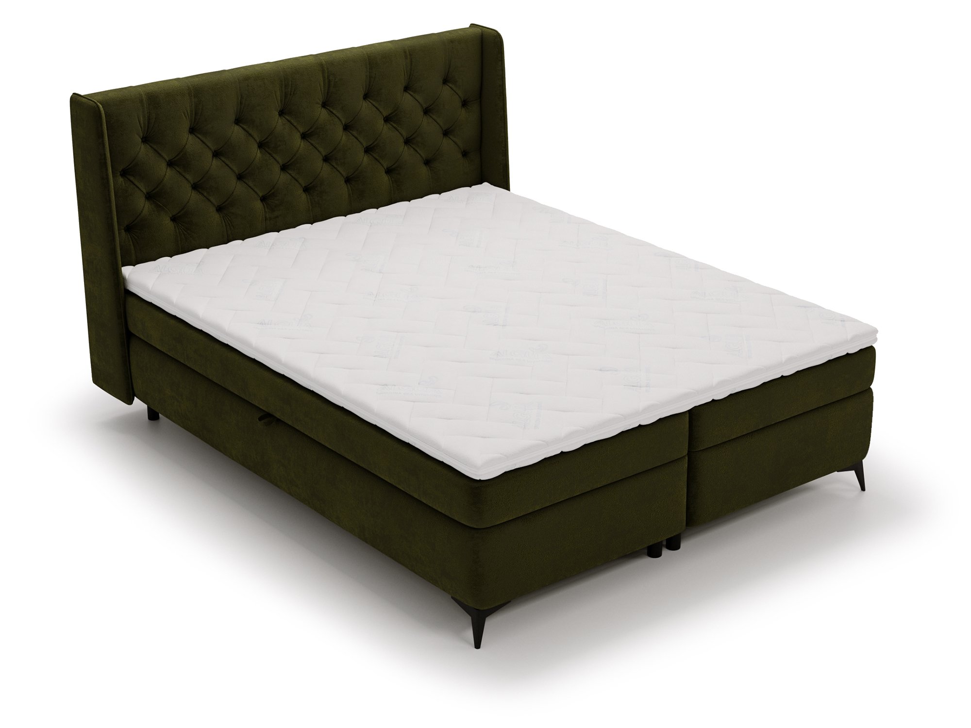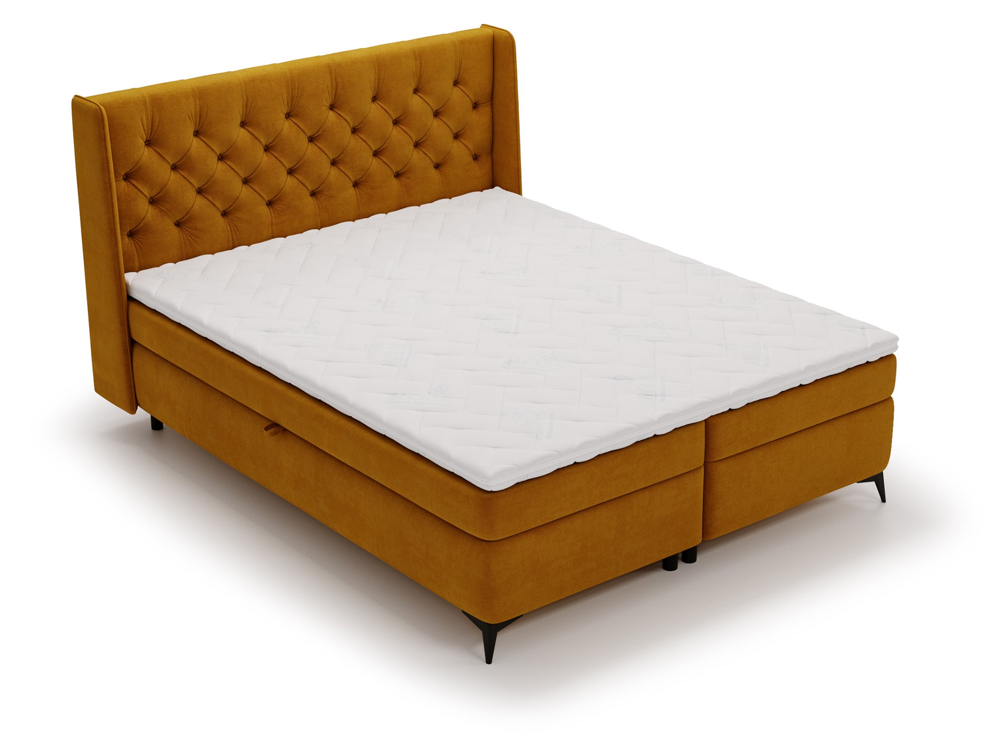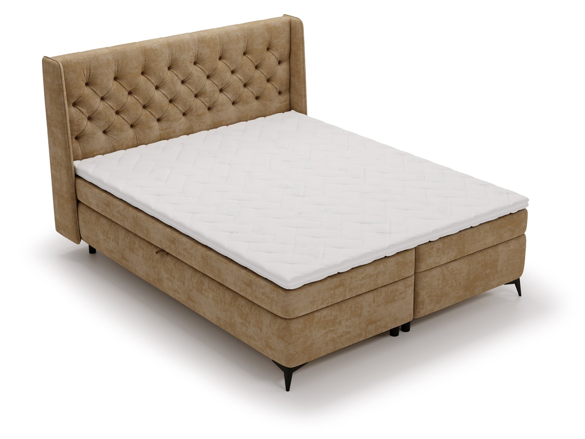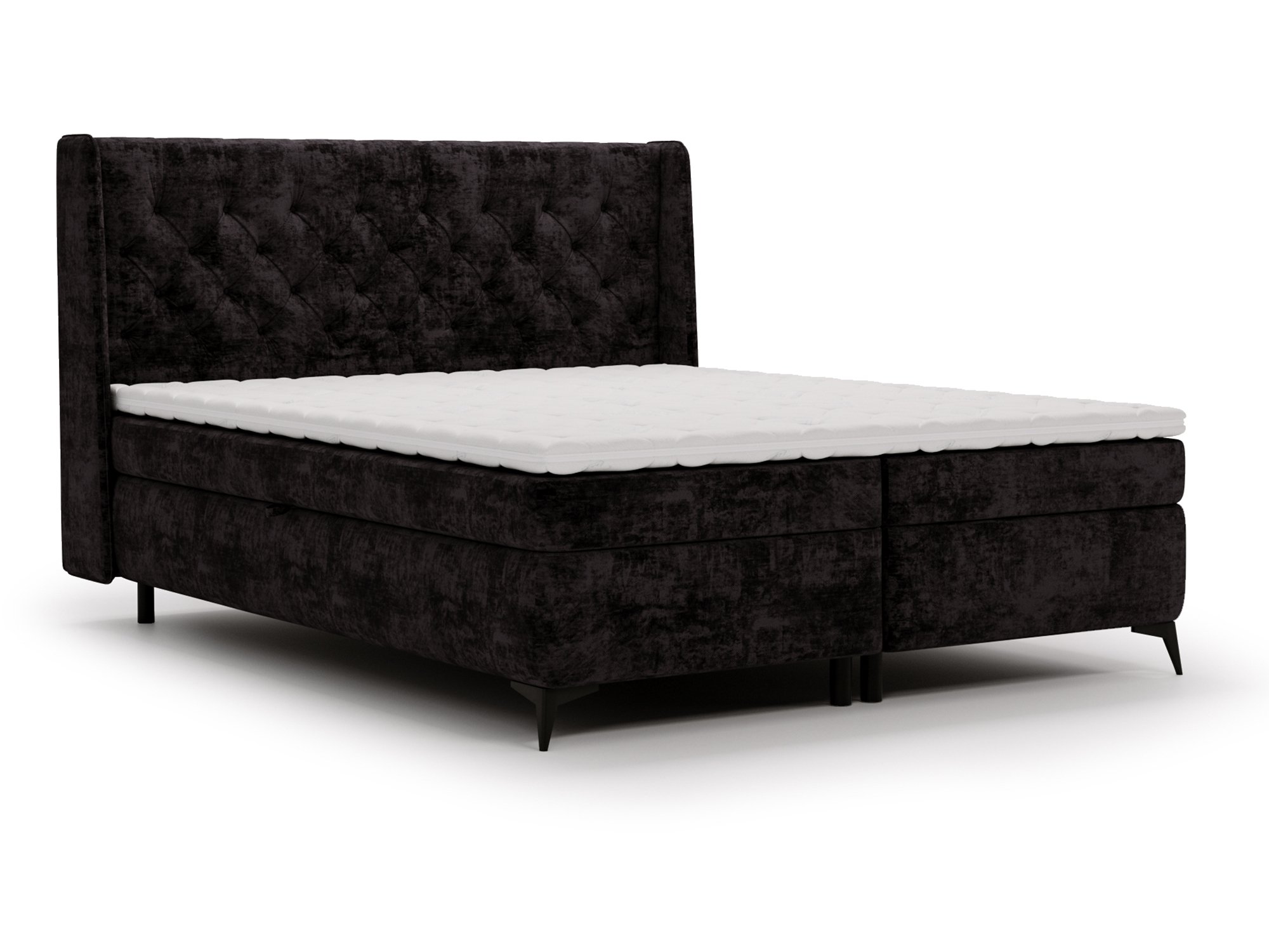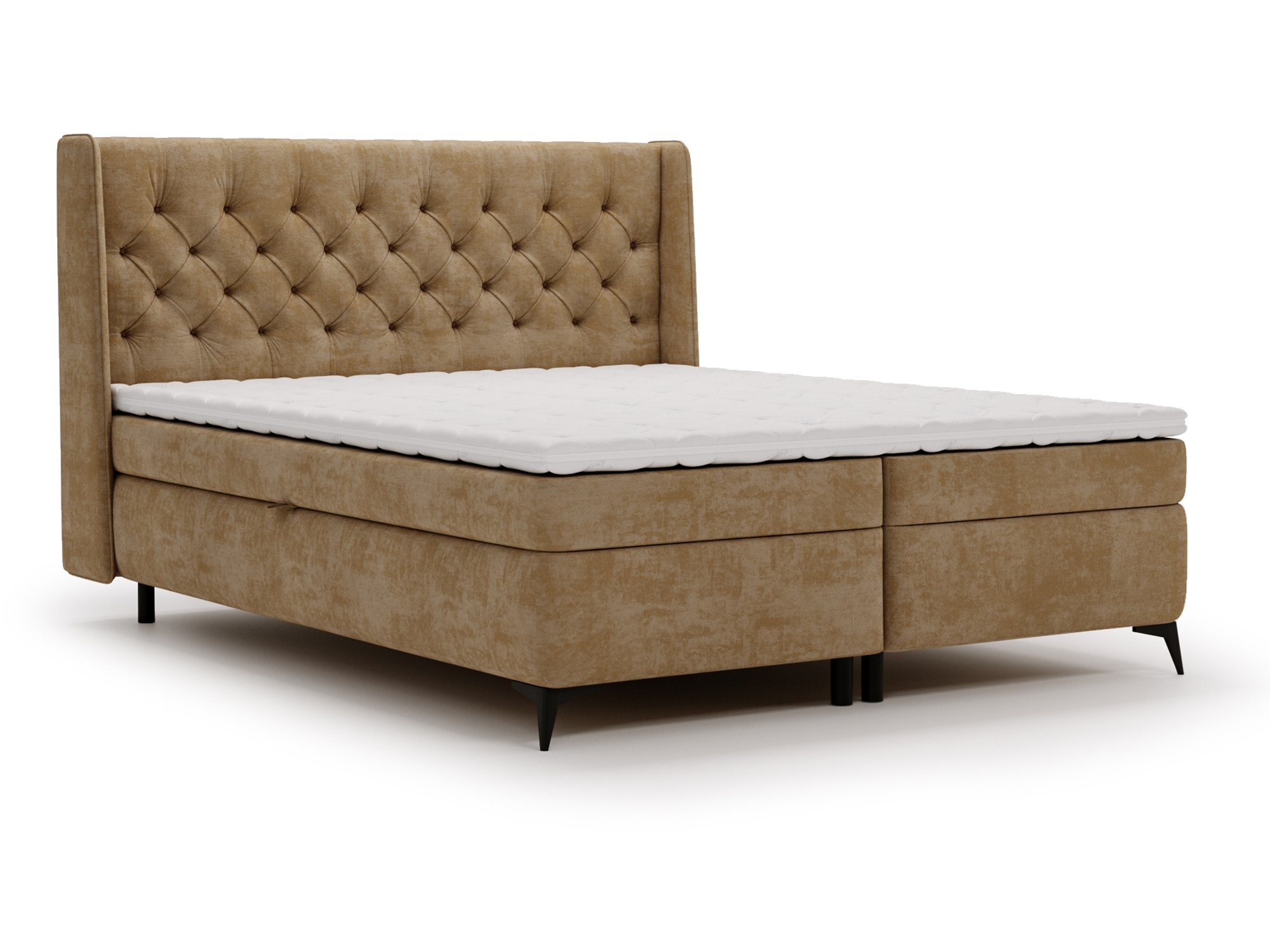 - Komfort warstwowy – konstrukcja kontynentalna (baza + materac bonellowy + topper) sprzyja wygodnemu, stabilnemu podparciu.