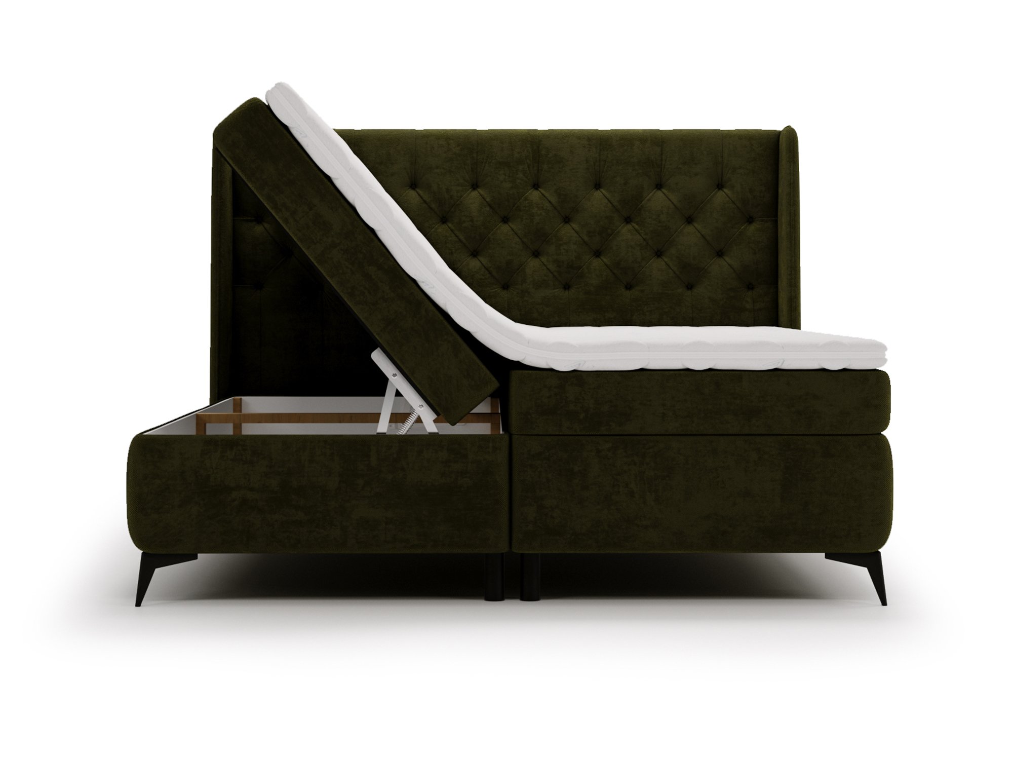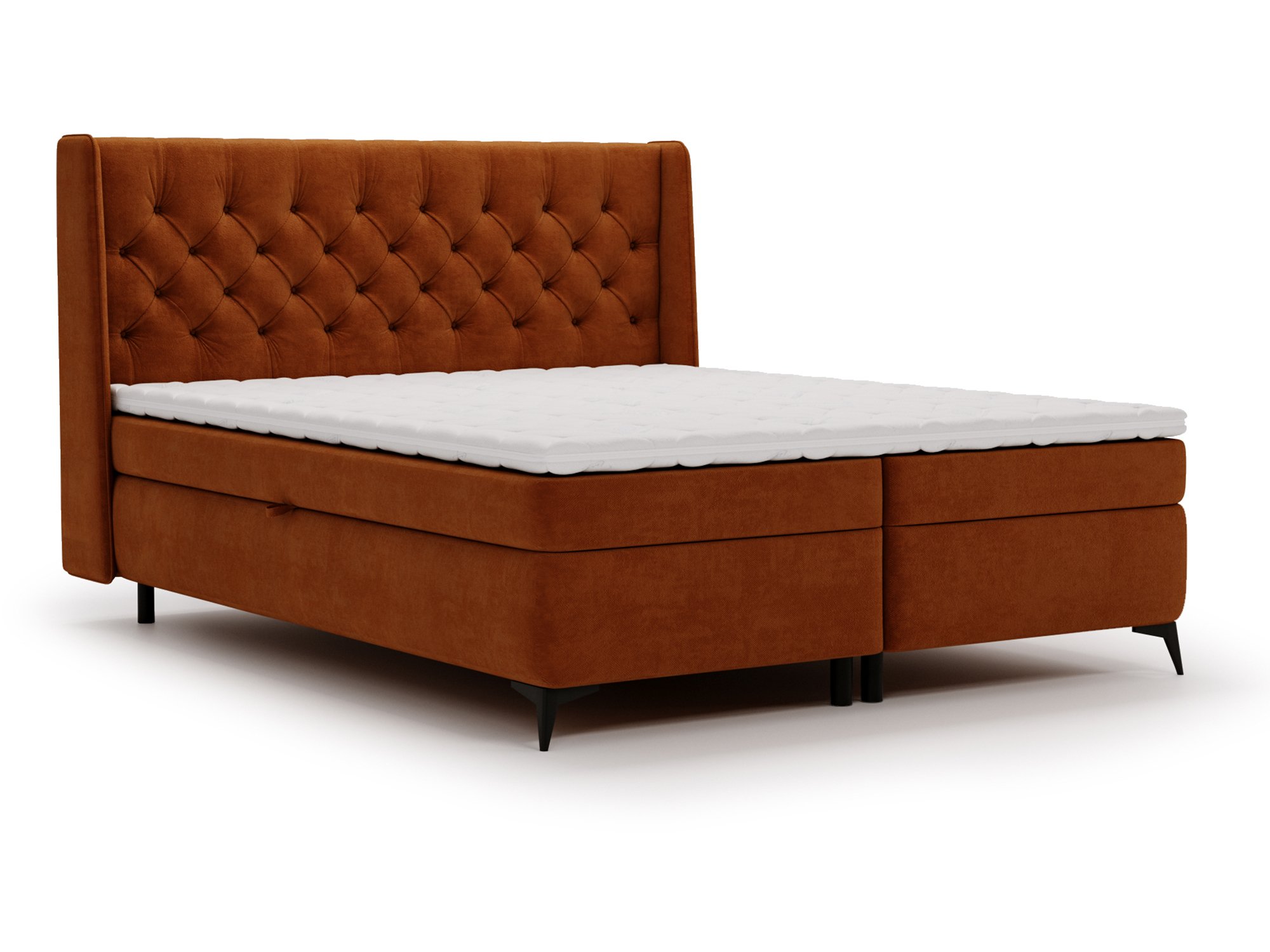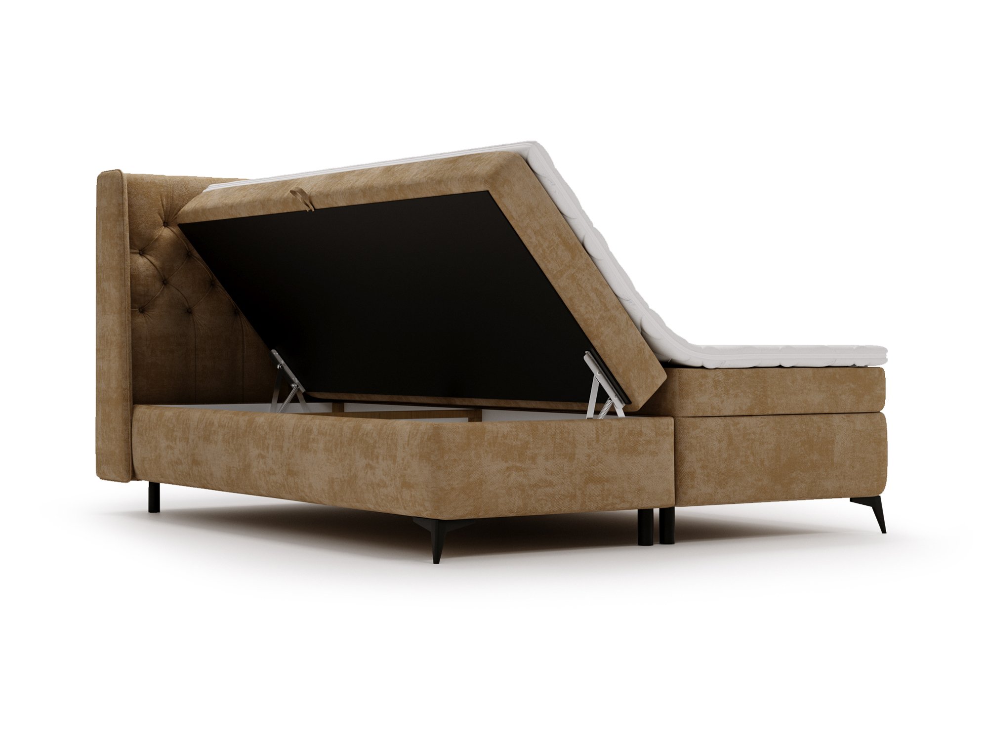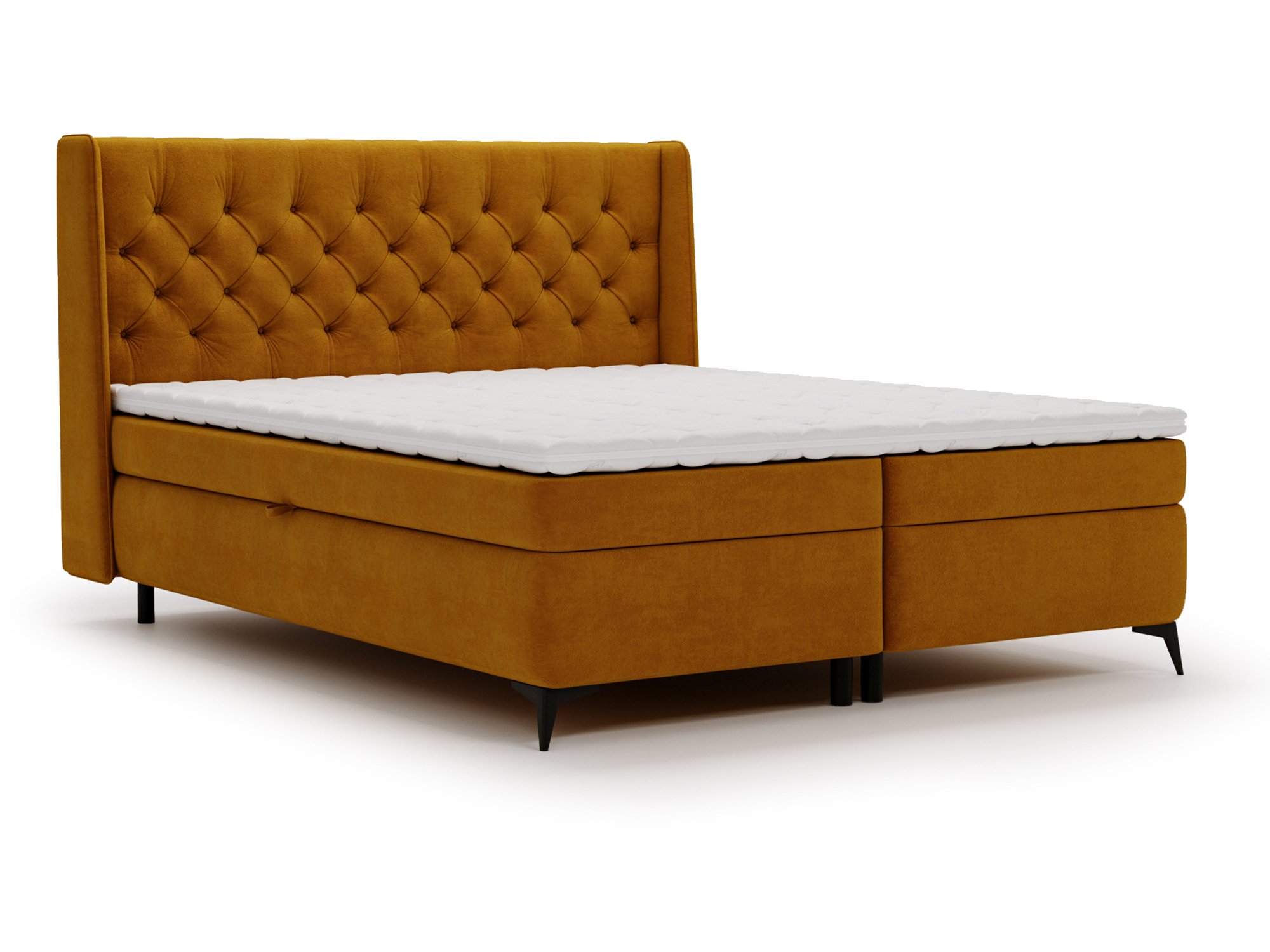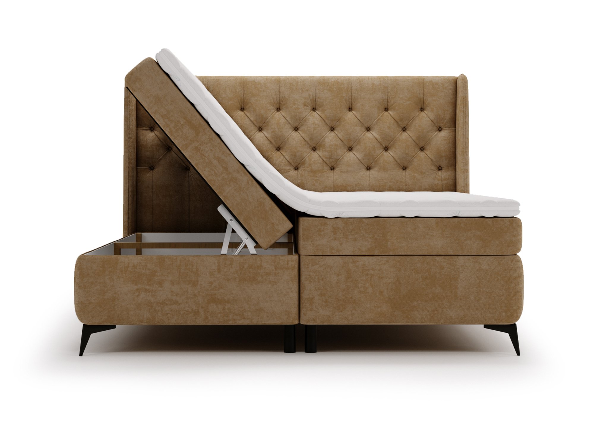 - Komfort warstwowy – konstrukcja kontynentalna (baza + materac bonellowy + topper) sprzyja wygodnemu, stabilnemu podparciu.