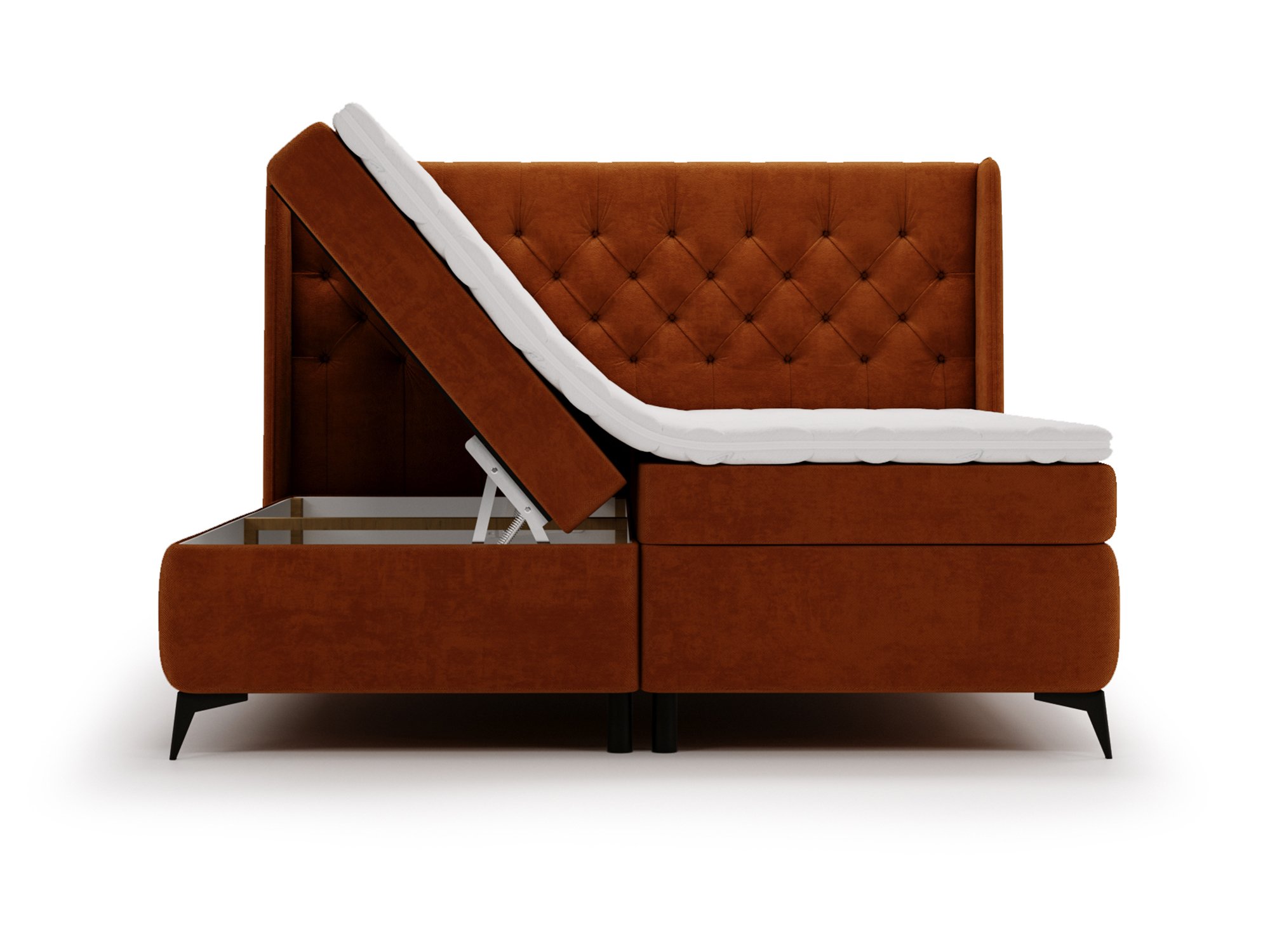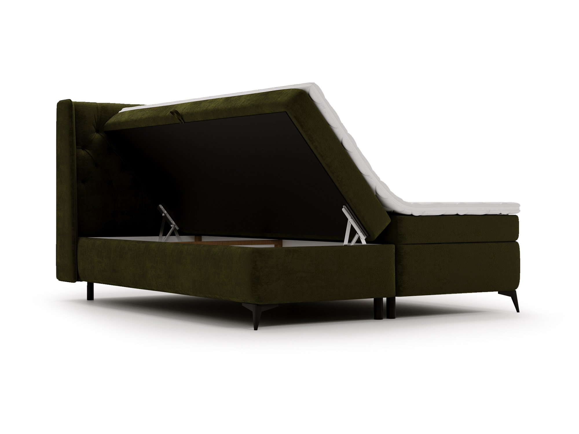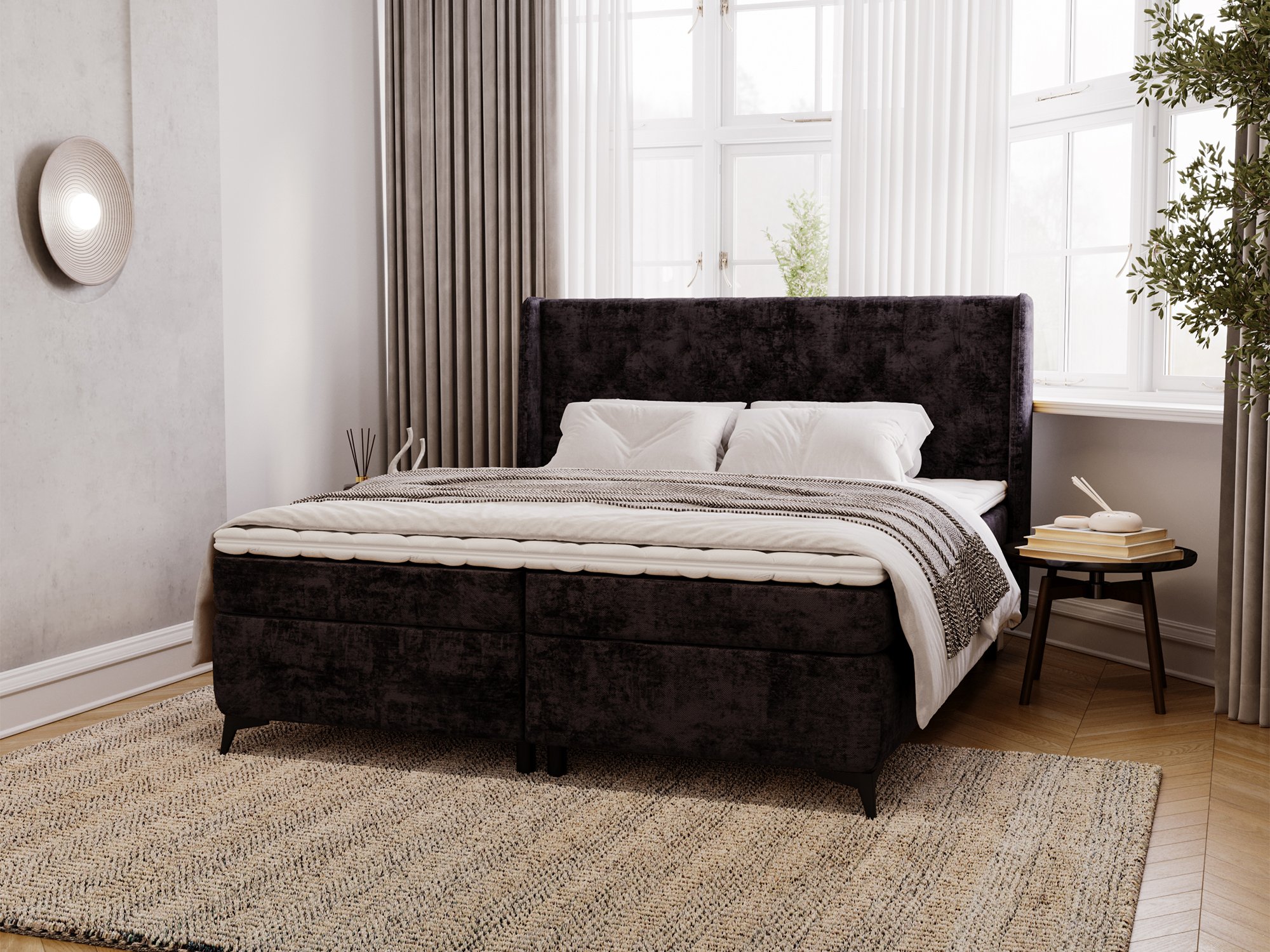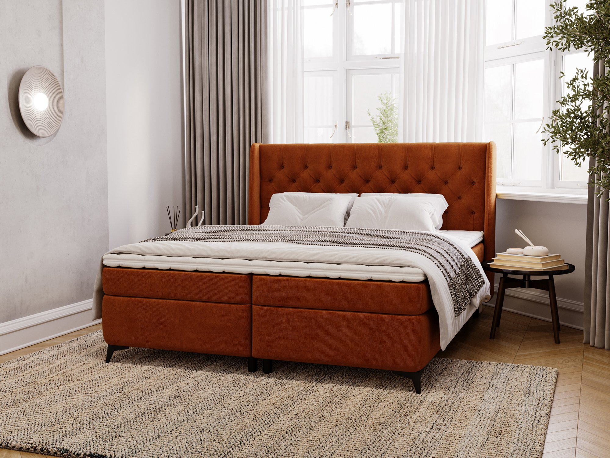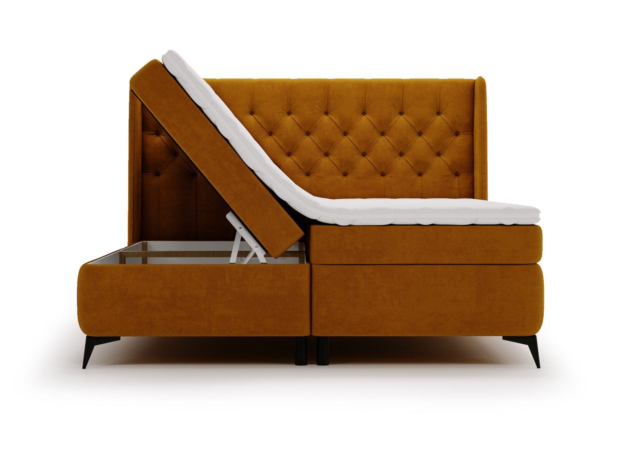 - Komfort warstwowy – konstrukcja kontynentalna (baza + materac bonellowy + topper) sprzyja wygodnemu, stabilnemu podparciu.