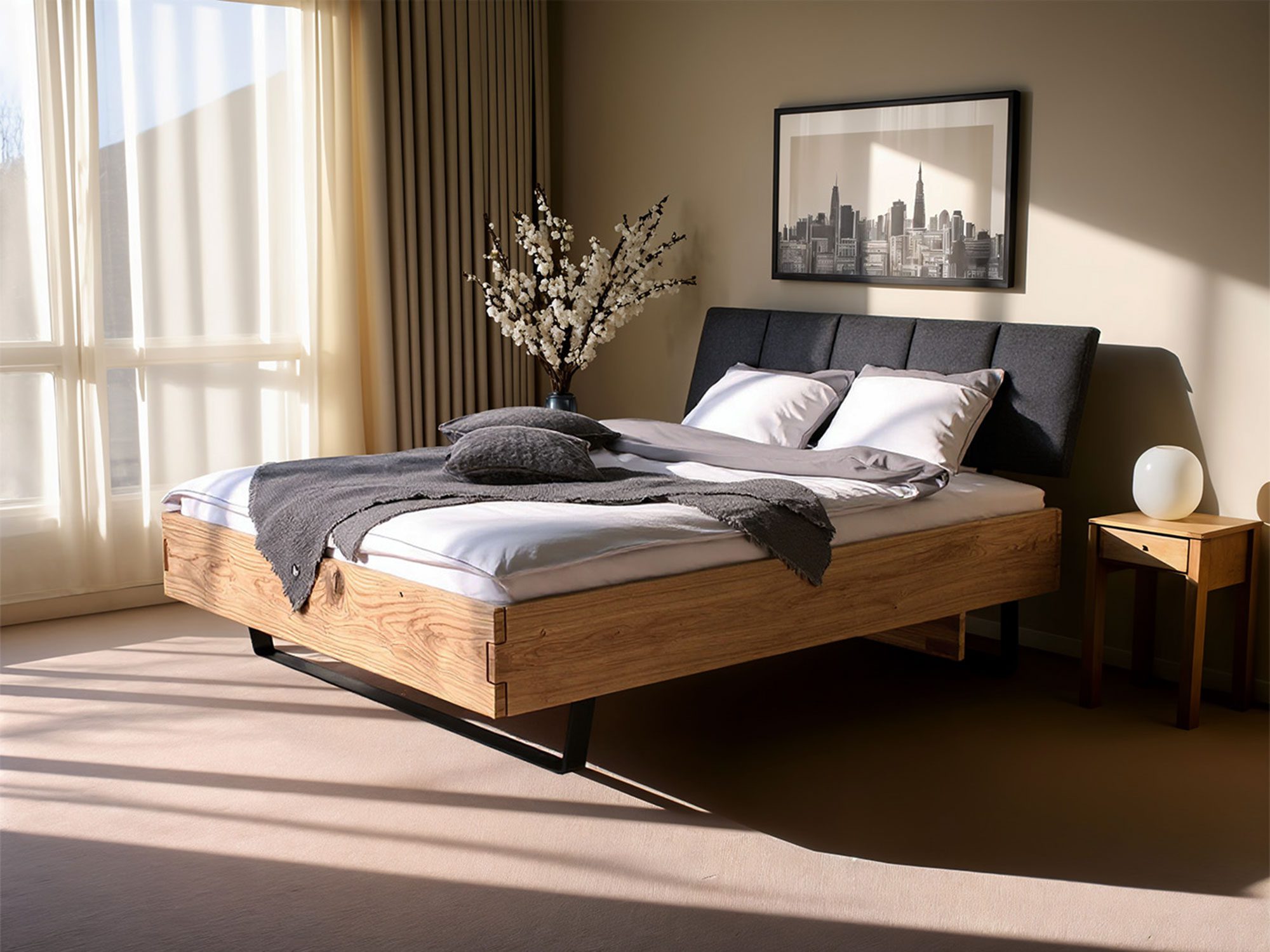 Lity dąb klasy premium to materiał o ponadprzeciętnej twardości i odporności. Naturalny olej na powierzchni uwydatnia usłojenie i stanowi ochronę przed codziennym użytkowaniem. Metalowa przednia noga, malowana proszkowo na kolor czarny, dodaje konstrukcji lekkości wizualnej i wzmacnia stabilność. Zagłówek z tkaniny INARI jest dostępny w kilku wersjach kolorystycznych – dopasujesz go do zasłon, dywanu czy pościeli, komponując spójną aranżację.