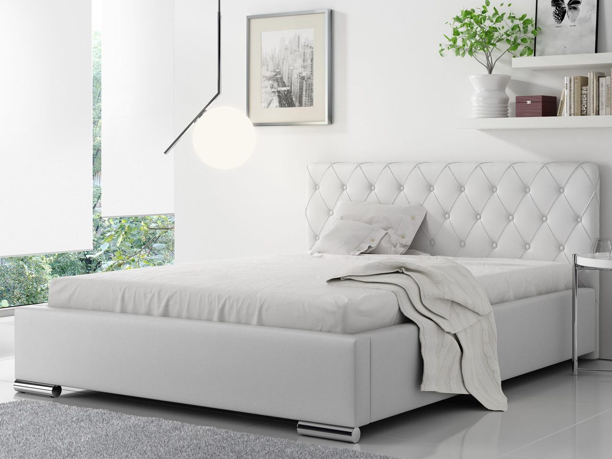 Białe łóżko z pikowanym zagłówkiem do nowoczesnej, jasnej sypialni