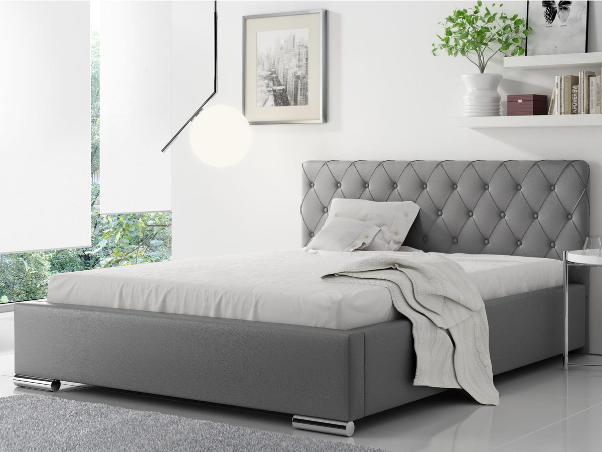 Szare łóżko sypialniane z welurowym zagłówkiem i eleganckim wykończeniem