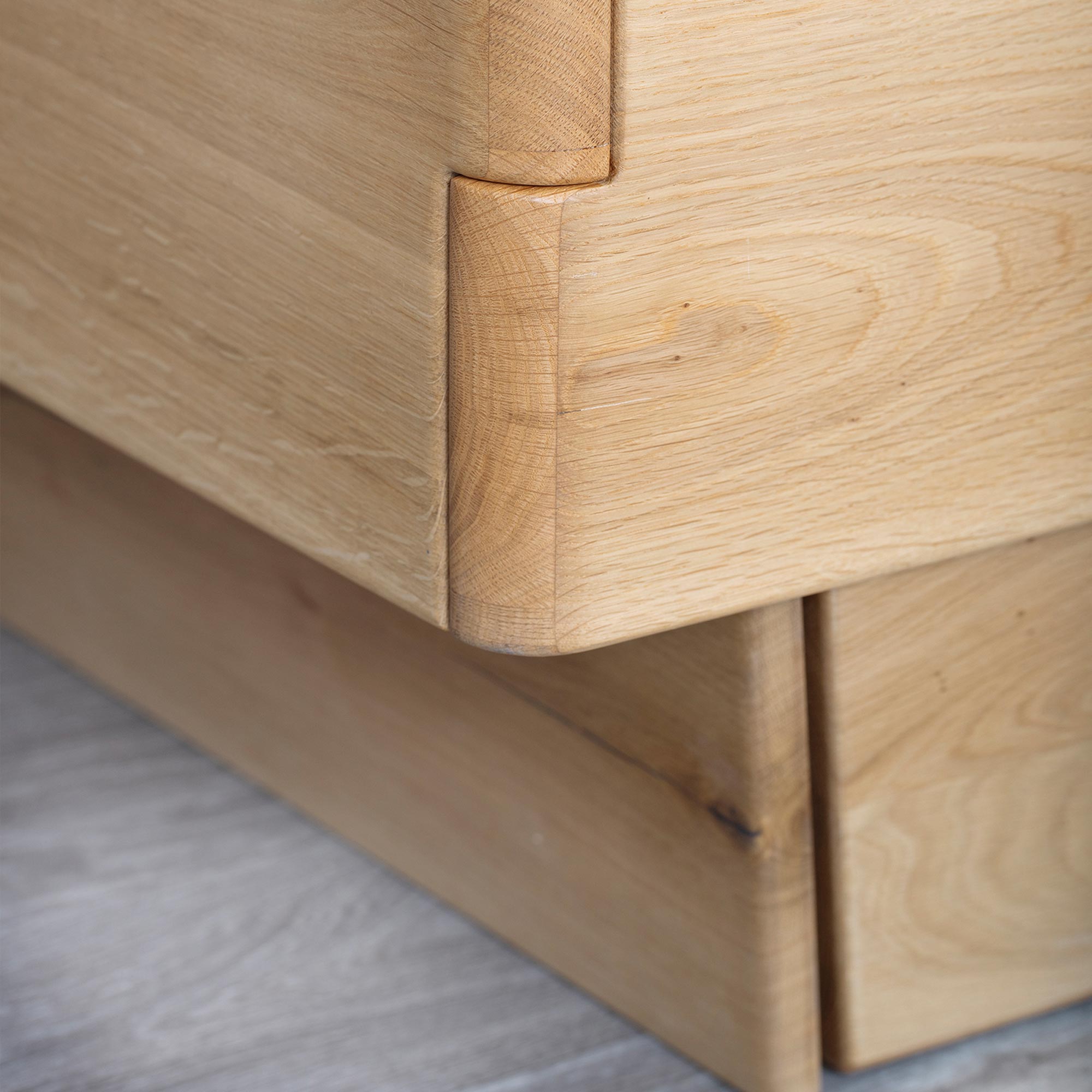 Wyobraź sobie sypialnię, w której estetyka spotyka się z porządkiem. Dasalia A to łóżko z litego drewna dębowego, które łączy emocjonalne piękno natury z logiką codziennej funkcjonalności: wysoki, tapicerowany zagłówek zachęca do wieczornego relaksu, a dwie duże szuflady dyskretnie przechowują pościel i tekstylia. Minimalistyczna bryła z miękko zaokrąglonymi krawędziami sprawia, że mebel harmonijnie wpisuje się w nowoczesne aranżacje – od japandi po skandynawski minimalizm.