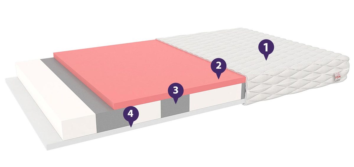- Wysoko elastyczna pianka poliuretanowa HR 6 cm – Profilowana powierzchnia dzieli materac na 7 stref, zapewniając idealne dopasowanie materaca do kształtu ciała.