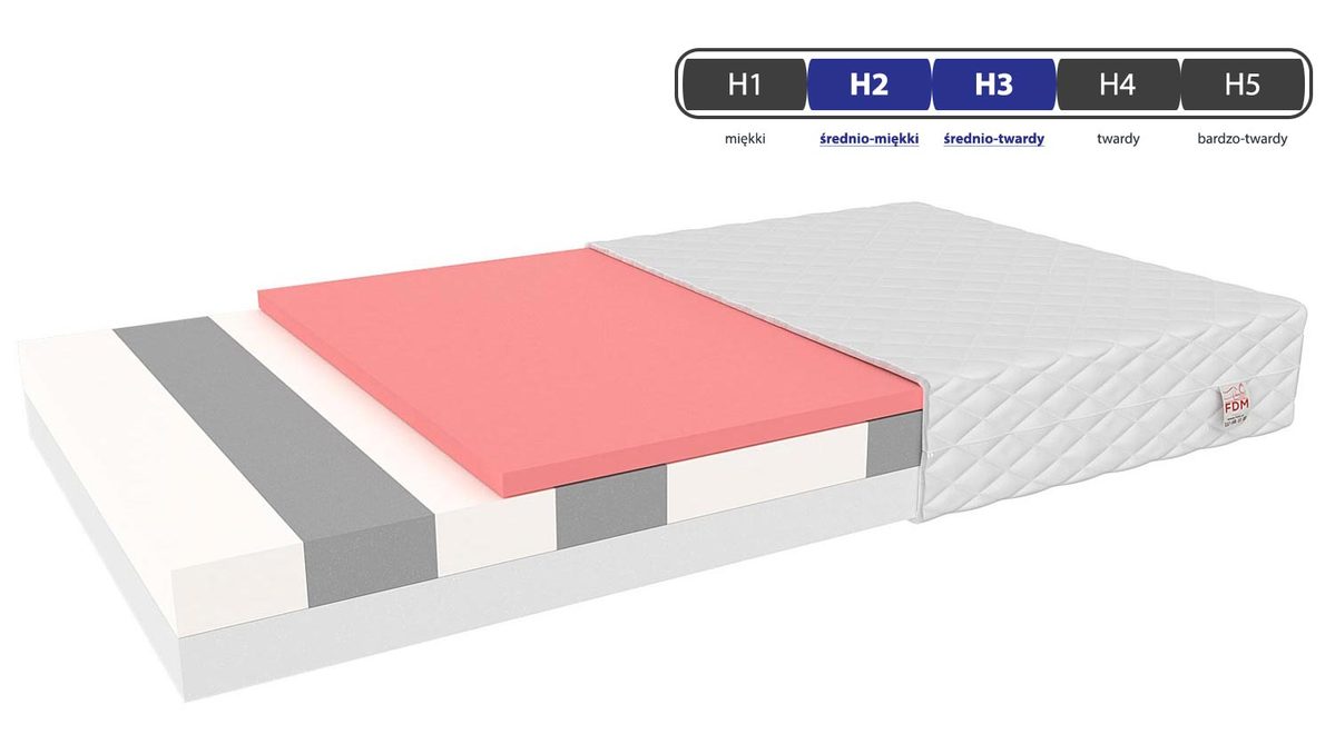 H1 – materac miękki (do 60 kg) | H2 – średnio-miękki (od 50 do 80 kg) H3 – średnio-twardy ( od 70 do 110 kg) | H4 – twardy (powyżej 100 kg)