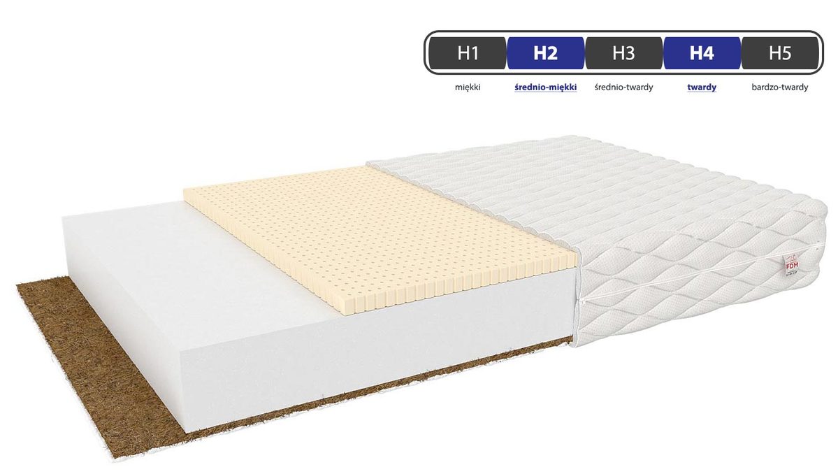 H1 – materac miękki (do 60 kg) | H2 – średnio-miękki (od 50 do 80 kg) H3 – średnio-twardy ( od 70 do 110 kg) | H4 – twardy (powyżej 100 kg)