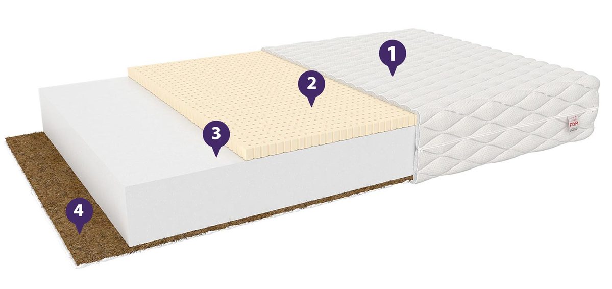 - Wysokość: 10 cm | Pokrowiec: Tak, zdejmowany | Budowa: Lateks 2 cm, pianka T25 9 cm, wkład kokosowy 1 cm, włókno klimatyzujące, pokrowiec