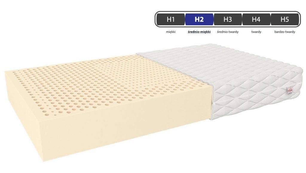H1 – materac miękki (do 60 kg) | H2 – średnio-miękki (od 50 do 80 kg) H3 – średnio-twardy ( od 70 do 110 kg) | H4 – twardy (powyżej 100 kg)