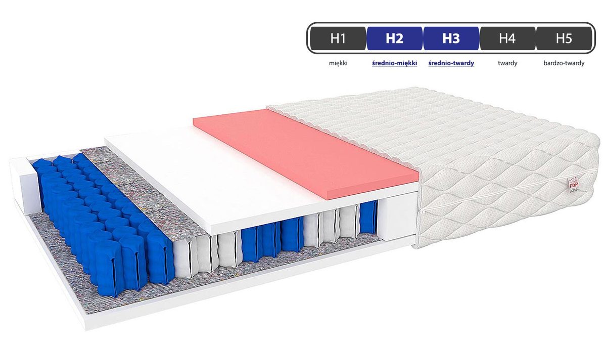 H1 – materac miękki (do 60 kg) | H2 – średnio-miękki (od 50 do 80 kg) H3 – średnio-twardy ( od 70 do 110 kg) | H4 – twardy (powyżej 100 kg)