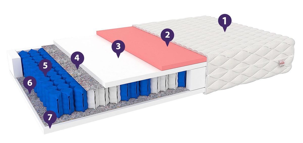 - 7-Strefowe Sprężyny Kieszeniowe – Sprężyny dzielą materac na 7 stref, każda o odpowiednim podparciu dla danej części ciała. Sprężyny pracują niezależnie od siebie, dzięki czemu dwie osoby śpiące koło siebie nie odczuwają dyskomfortu z powodu wiercenia się drugiej osoby. Materac jest również znakomity dla osób o różnej wadze ciała, ponieważ materac nie ugina się w stronę drugiej osoby.