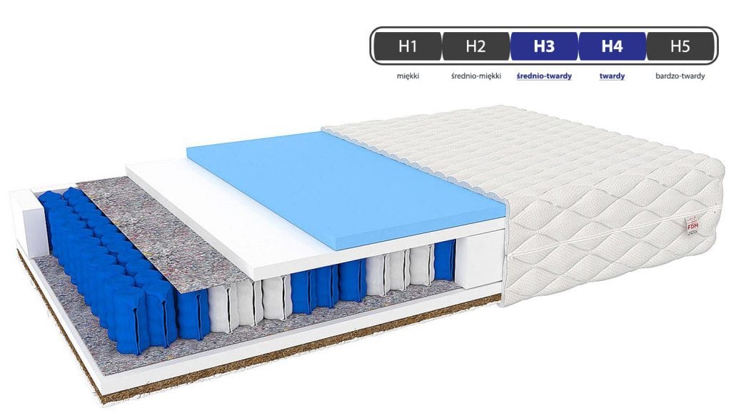 H1 – materac miękki (do 60 kg) | H2 – średnio-miękki (od 50 do 80 kg) H3 – średnio-twardy ( od 70 do 110 kg) | H4 – twardy (powyżej 100 kg)