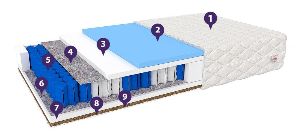 9. Włókno Klimatyzujące – Puszysta włóknina syntetyczna, która kontynuuje transportowanie powietrza oraz dodatkowo ociepla materac.