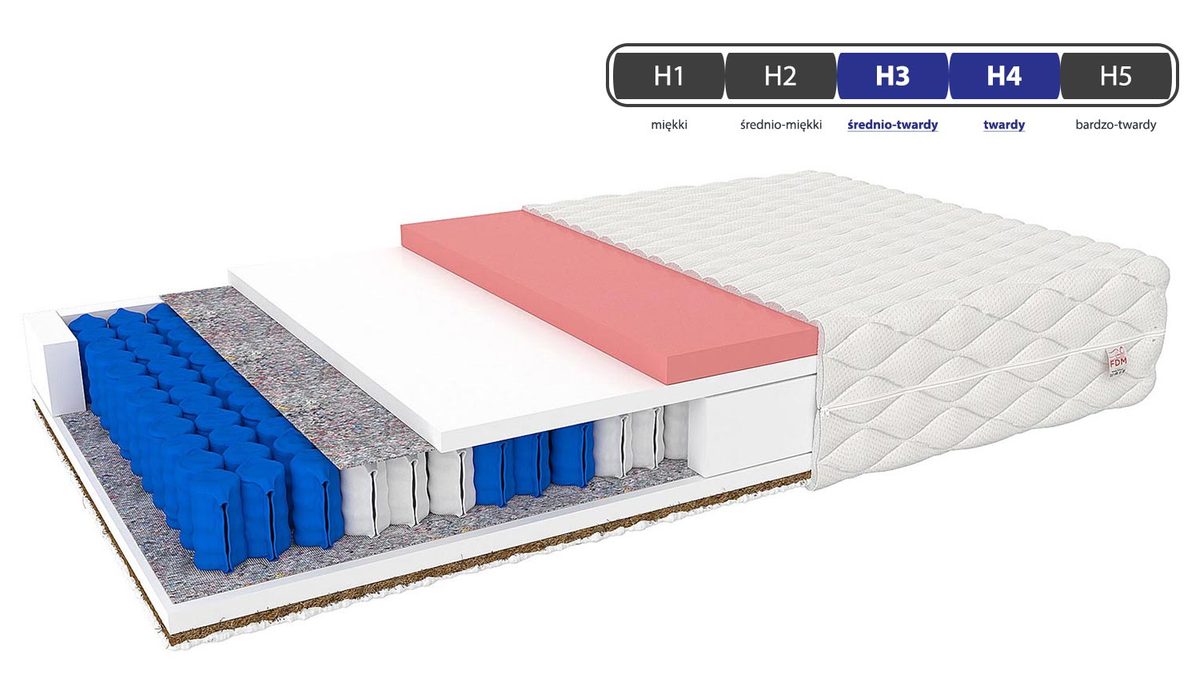 H1 – materac miękki (do 60 kg) | H2 – średnio-miękki (od 50 do 80 kg) H3 – średnio-twardy ( od 70 do 110 kg) | H4 – twardy (powyżej 100 kg)