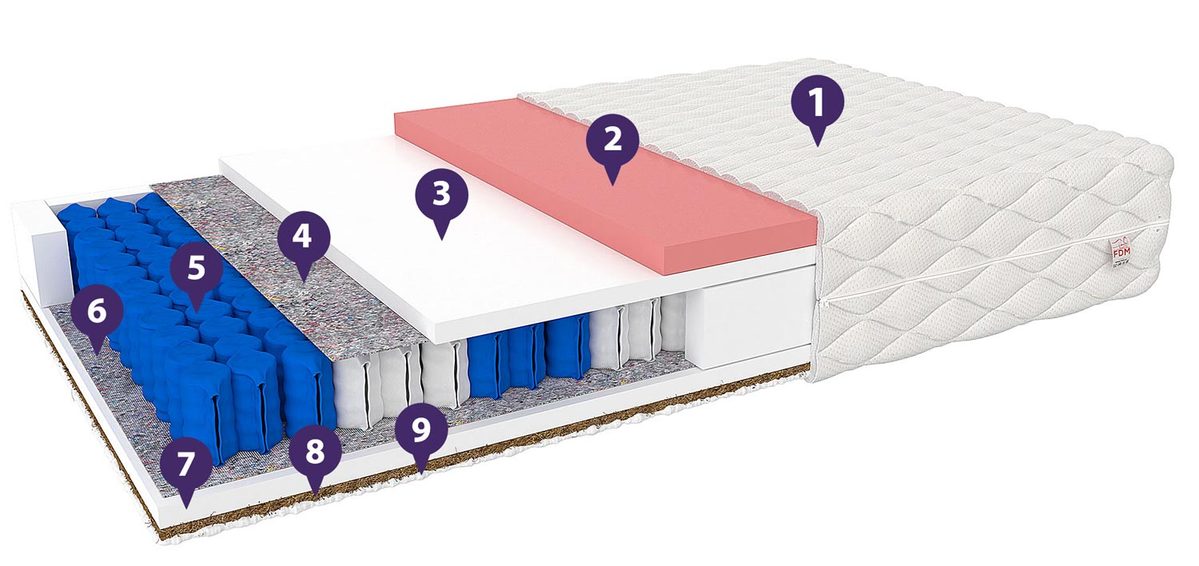 - 7-Strefowe Sprężyny Kieszeniowe – Sprężyny dzielą materac na 7 stref, każda o odpowiednim podparciu dla danej części ciała. Sprężyny pracują niezależnie od siebie, dzięki czemu dwie osoby śpiące koło siebie nie odczuwają dyskomfortu z powodu wiercenia się drugiej osoby. Materac jest również znakomity dla osób o różnej wadze ciała, ponieważ materac nie ugina się w stronę drugiej osoby.