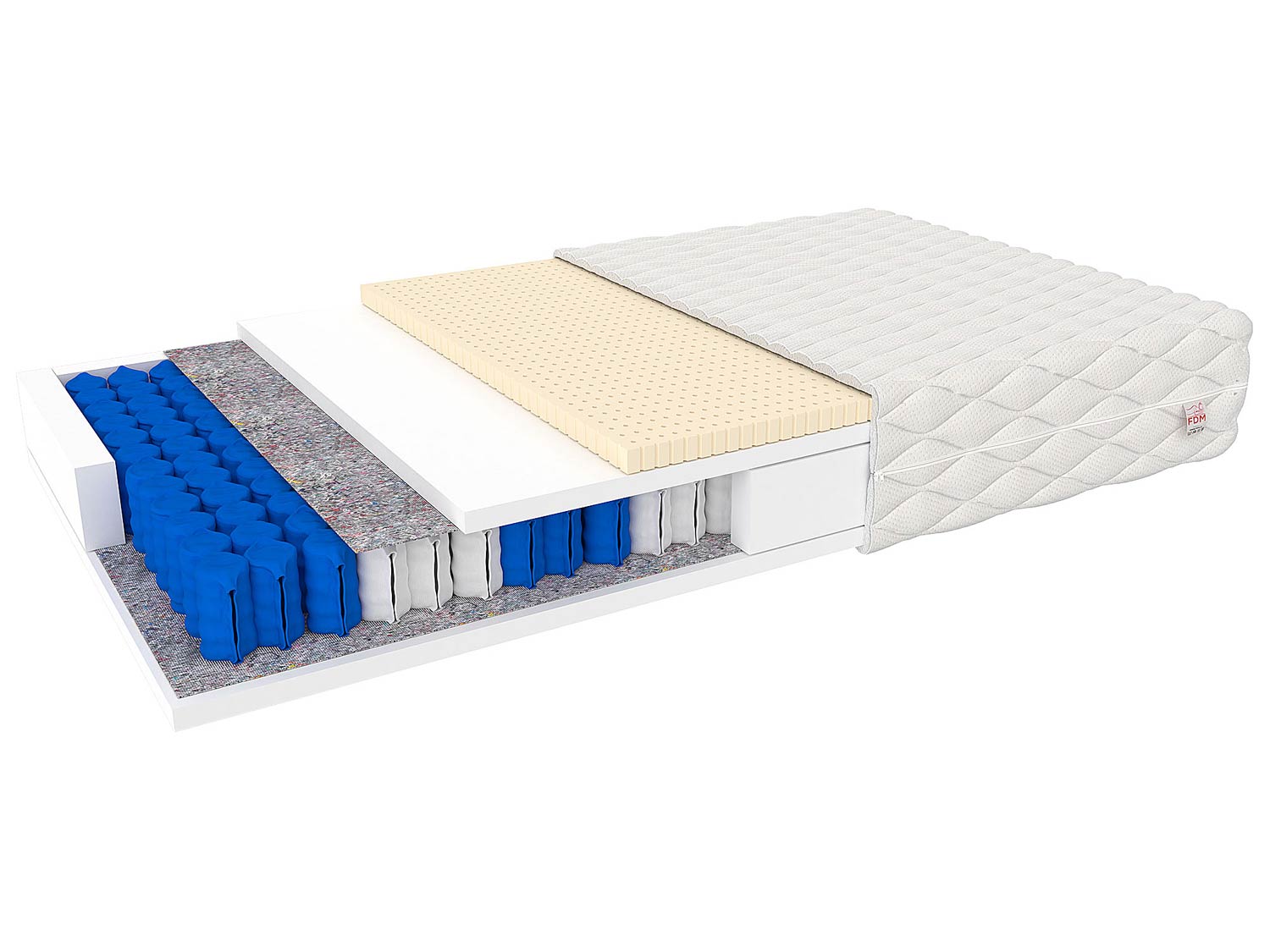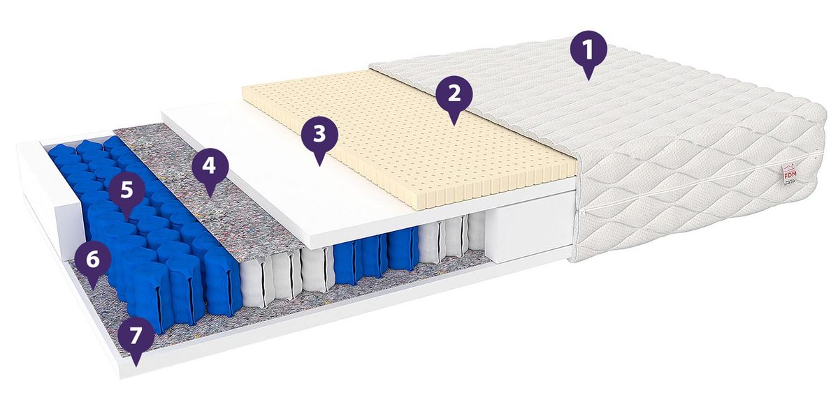 - 7-Strefowe Sprężyny Kieszeniowe – Sprężyny dzielą materac na 7 stref, każda o odpowiednim podparciu dla danej części ciała. Sprężyny pracują niezależnie od siebie, dzięki czemu dwie osoby śpiące koło siebie nie odczuwają dyskomfortu z powodu wiercenia się drugiej osoby. Materac jest również znakomity dla osób o różnej wadze ciała, ponieważ materac nie ugina się w stronę drugiej osoby.