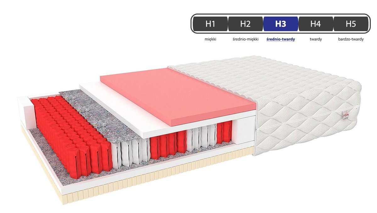H1 – materac miękki (do 60 kg) | H2 – średnio-miękki (od 50 do 80 kg) H3 – średnio-twardy ( od 70 do 110 kg) | H4 – twardy (powyżej 100 kg)