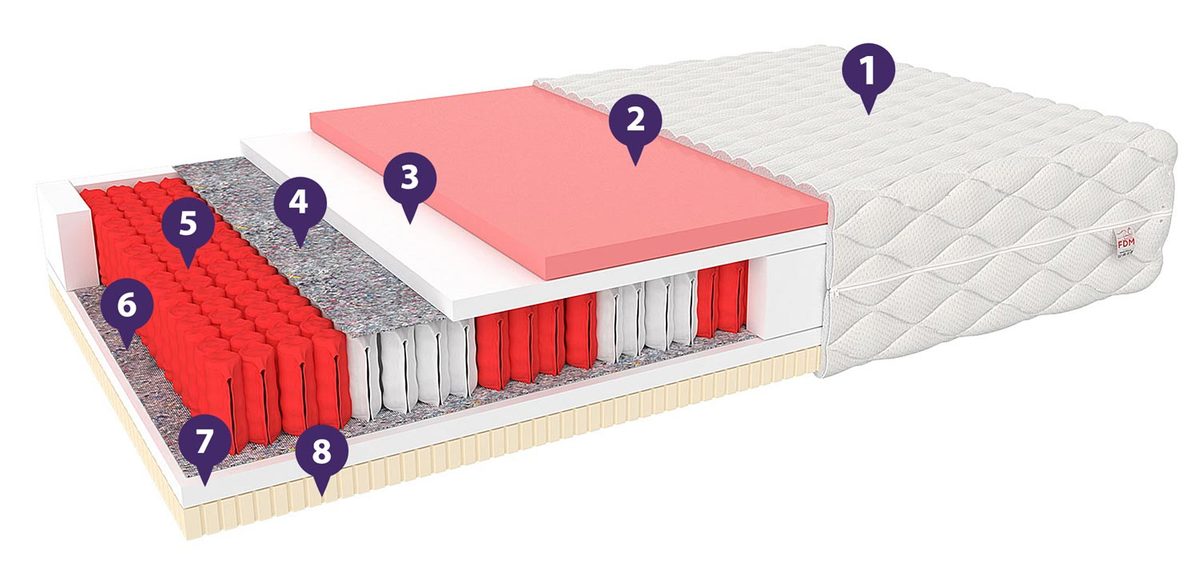 - 7-Strefowe Sprężyny Multipocketowe – Sprężyny dzielą materac na 7 stref, każda o odpowiednim podparciu dla danej części ciała. Większa ilość sprężyn pracuje niezależnie od siebie, dzięki czemu dwie osoby śpiące koło siebie nie odczuwają dyskomfortu z powodu wiercenia się drugiej osoby. Materac jest również znakomity dla osób o różnej wadze ciała, ponieważ materac nie ugina się w stronę drugiej osoby.