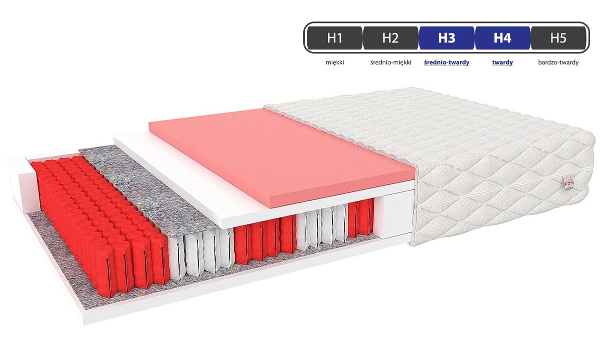 H1 – materac miękki (do 60 kg) | H2 – średnio-miękki (od 50 do 80 kg) H3 – średnio-twardy ( od 70 do 110 kg) | H4 – twardy (powyżej 100 kg)