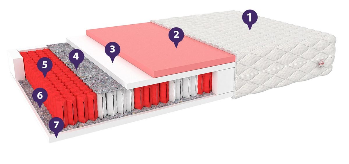 - 7-Strefowe Sprężyny Multipocketowe – Sprężyny dzielą materac na 7 stref, każda o odpowiednim podparciu dla danej części ciała. Większa ilość sprężyn pracuje niezależnie od siebie, dzięki czemu dwie osoby śpiące koło siebie nie odczuwają dyskomfortu z powodu wiercenia się drugiej osoby. Materac jest również znakomity dla osób o różnej wadze ciała, ponieważ materac nie ugina się w stronę drugiej osoby.