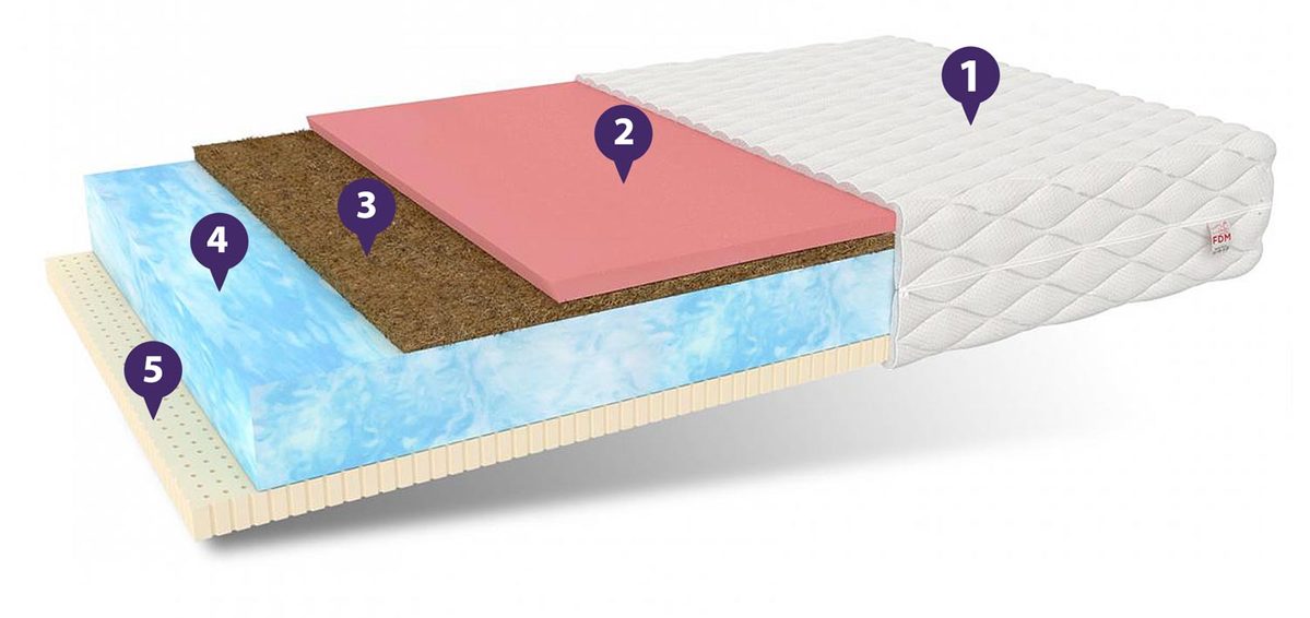 - Lateks – posiada szerokie właściwości antyalergicznych, dzięki czemu ogranicza rozwój pleśni, roztoczy i grzybów. Lateks cechuje się wysoką elastycznością. Materiał bardzo wytrzymały i odporny na zużycie, dzięki czemu może być użytkowany przez wiele lat Warstwa perforowanego lateksu odpowiednio dopasowuje się do kształtu ciała i zapewnia sprawną wentylację podczas snu. Za każdym razem gdy się obracasz lub przesuwasz, warstwa lateksu ulega ściskaniu i rozprężaniu, w wyniku czego kanaliki wewnętrzne transportują powietrze dzięki czemu zapobiega poceniu się i rozwojowi grzybów.