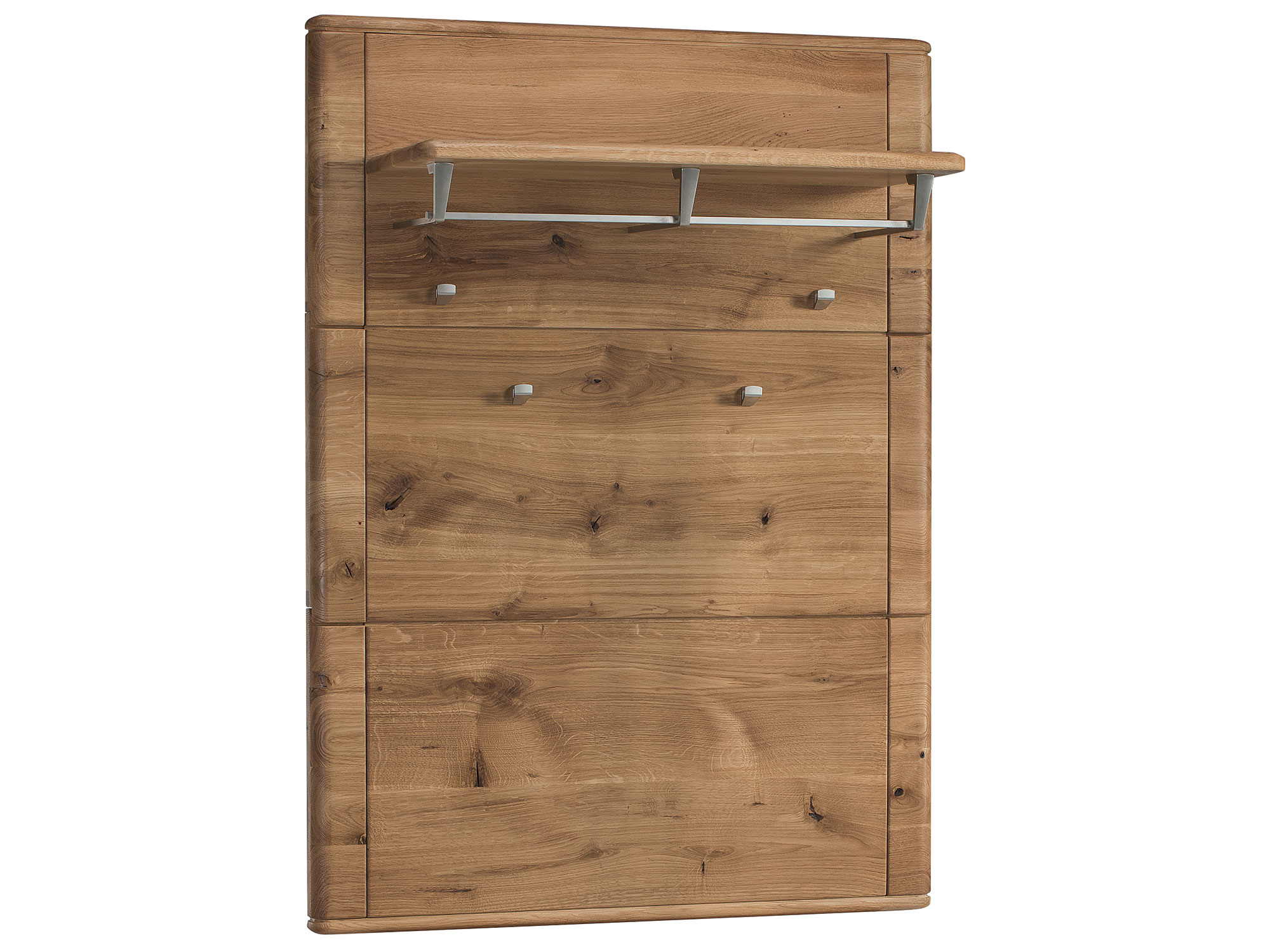 Prosty i elegancki panel wykonany z najwyższej jakości litego drewna dębowego wspaniale wpasuje się w stylizację panującą w każdym wnętrzu. Również stateczna konstrukcja oraz nowomodne, stylowe szlifowanie sprawią, że drewniany wieszak do przedpokoju wspaniale spełni swoje zadanie. W dodatku mebel posiada praktyczną półkę, na której znajdzie się miejsce dla czapek czy szalików, a nawet rękawiczek. Ponadto na funkcjonalnych haczykach z łatwością można powiesić kurtki i płaszcze. Oprócz tego solidny reling bez wątpienia utrzyma parasol czy wieszak z futrem.