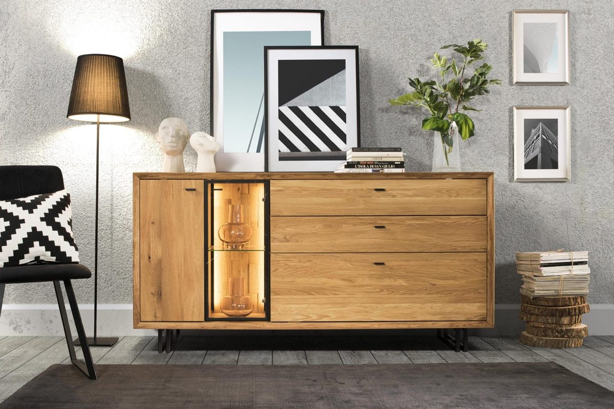 Gustowna i nowomodna komoda Toledo do pokoju zrobiona z litego drewna dębowego najlepszego gatunku z fornirowanymi detalami idealnie dopasuje się do każdego wnętrza niejednej jadalni czy salonu. Stateczna konstrukcja oraz gustowne i awangardowe wykończenie sprawią, że drewniana komoda do salonu fenomenalnie uatrakcyjni każde wnętrze. Toledo posiada funkcjonalne drzwiczki, klapę i bardzo praktyczną szufladę, a także przeszkloną cześć, która wyeksponuje każdą dekorację.