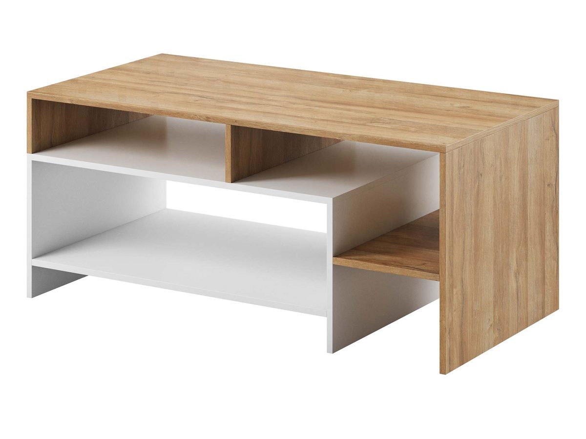 Stolik kawowy został wyposażony w świetnie pasujące, bardzo nowoczesne półki. Dzięki temu mebel doskonale przyda się do przechowywania różnych przedmiotów i utrzymania ładu w domu czy mieszkaniu. Dodatkowo na dużym blacie z powodzeniem można ustawić filiżanki i inne potrzebne przedmioty, gdy zjawią się goście. Eleganckie półeczki świetnie prezentują się w danej kolorystyce oraz zapewniają dodatkowe miejsce do przechowywania. Funkcjonalny stolik został wyprodukowany z materiałów najwyższej jakości, laminowanych płyt meblowych. Dany mebel w dodatku zabezpieczono obrzeżem ABS, które sprawia, że jest ona odporna na zniszczenia, wzmacnia trwałość i zabezpiecza przed wilgocią, a także uszkodzeniami mechanicznymi.