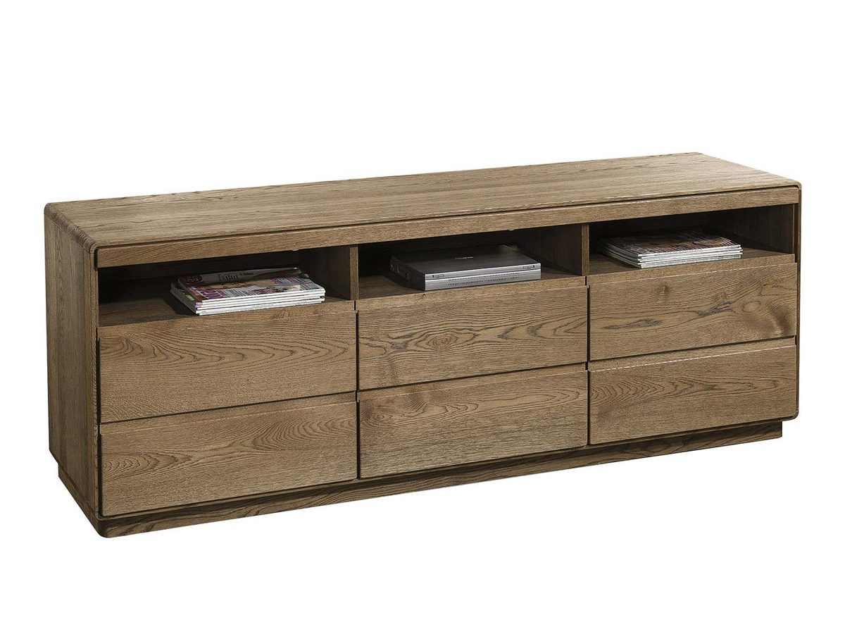 Prezentowana szafka pod TV drewniana to wyjątkowy mebel, nadający każdemu wnętrzu niepowtarzalnego stylu i szykowności. Ponadto materiały wysokiej jakości zostały wykorzystane do produkcji szafki, składa się ona z najlepszego litego drewna dębowego z elementami fornirowanymi. Szafka drewniana pod telewizor posiada 2 drzwi, za którymi mieści się dogodna przestrzeń do przechowywania różnych drobiazgów i sprzętu RTV niewielkich rozmiarów, a także dwie pojemne szuflady oraz trzy półki, gdzie idealnie zmieści się konsola, dekoder lub odtwarzacz.