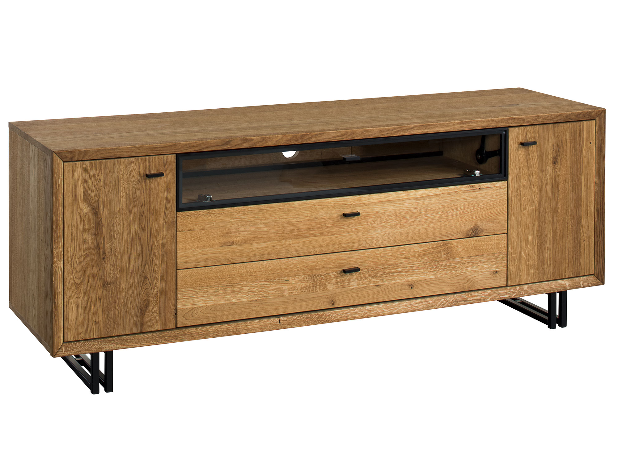 Prosta i elegancka szafka do salonu Toledo wyprodukowana z najlepszej klasy litego dębu i forniru. Ponadto wspaniale wpasuje się w stylizację panującą w niejednej jadalni czy salonu. Mocna struktura oraz eleganckie, nowoczesne wykończenie sprawią, że szafka pod telewizor dębowa fenomenalnie uatrakcyjni każde wnętrze. Toledo posiada funkcjonalne drzwiczki i dwie praktyczne szuflady, a także szafkę za przeszkloną klapą.