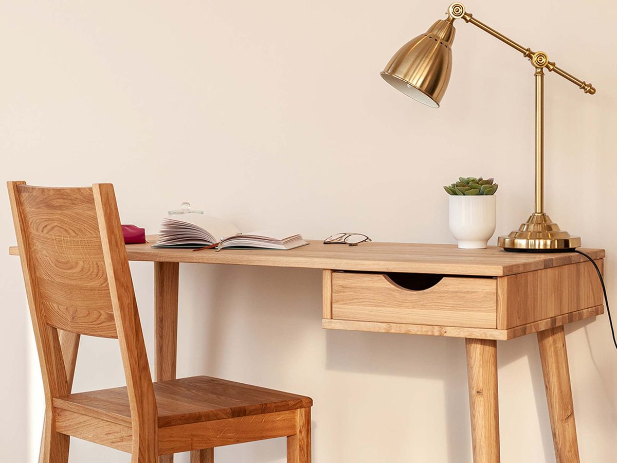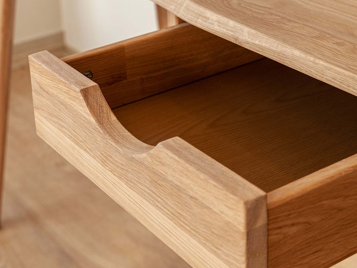 Przede wszystkim prezentowany mebel Lina może pełnić funkcję zarówno toaletki jak i biurka. Ze względu na prostotę w bryle i neutralne wybarwienie, doskonale wpasuje się w każdej sypialni jak i salonie do stworzenia kącika home office. Co więcej na szczególną uwagę zasługuje materiał wykonania, gdyż jest to lite drewno dzikiego dębu. Charakteryzuje się gęsto zlokalizowanymi ciemnymi sękami, które naturalnie występują w strukturze drewna. Bez wątpienia dodaje to charakteru i uroku meblu. Ponadto jest to gwarancja solidności wykonania i długoletniej trwałości. Dodatkowo szuflada wygodnie otwierana pozwala na schowanie drobnych akcesoriów czy dokumentów mając je zawsze pod ręką. Co więcej, biurko toaletka osadzona jest na zaokrąglonych nóżkach, co zdecydowanie dodaje mu lekkości, dzięki czemu nie zaburza estetyki przestrzeni.