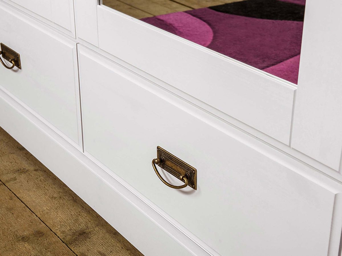 Przede wszystkim duża szafa z lustrem ANADI zawiera na środku dużą przestrzeń z drążkiem na ubrania oraz pojemną półkę na samej górze, do przechowywania rzeczy nieczęsto używanych. Z kolei po prawej i lewej stronie znajdują się trzy półki- po każdej stronie, co zapewnia dostateczną przestrzeń na organizację zarówno ubrań, jak i dokumentów czy innych akcesoriów. Dodatkowo cztery szuflady na samym dole mebla dają możliwość przechowywania drobniejszych rzeczy. Z tego względu z pewnością oferowana szafa nie pozostawia pola do narzekania na małą ilość miejsca w szafie. Co więcej ozdobny wieniec, cokół i subtelne frezy w stylu prowansalskim tworzą schludny, ale elegancki mebel. Prosta bryła i neutralne wybarwienia pozwalają na zaaranżowanie szafy zarówno w stylach klasycznych jak i nowoczesnych. Ponadto, materiałem wykonania jest lite drewno sosnowe, co daje gwarancję solidności wykonania oraz doskonałej trwałości na długie lata.