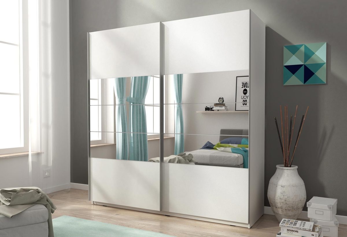 Pojemna szafa na ubrania GAYA I 200cm to niezwykle nowoczesna i funkcjonalna szafa przesuwna. Jej dość standardowy wygląd przełamany poziomymi lustrami biegnącymi przez cala szerokość szafy, to nieszablonowe ułożenie lustra nadaje szafie niecodziennego wyglądu. Praktyczne fronty przesuwne pozwalają zaoszczędzić miejsce, ponieważ nie jest potrzebna przestrzeń przed szafą, by otworzyć drzwi.