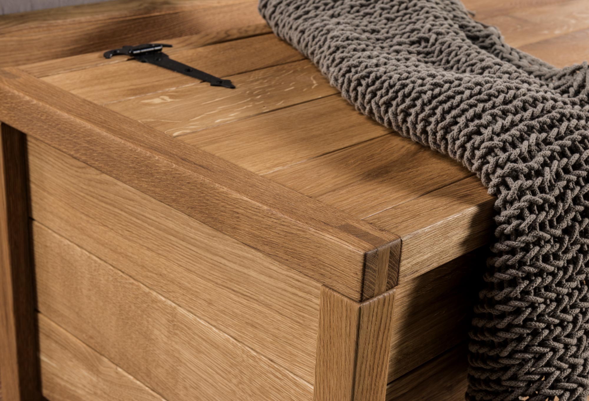 Gustowny i nowomodny kufer Hidos wyprodukowany z najlepszej klasy litego dębu wspaniale wpasuje się w stylizację panującą w każdej sypialni i pokoju dziennym. Mocna konstrukcja oraz gustowne i awangardowe wykończenie sprawią, że skrzynia dębowa szykownie upiększy niejedno pomieszczenie. Box posiada funkcjonalną klapę, do której dołączona jest też poduszka w kolorze czarnym. Dzięki temu skrzynia może zmienić się w wygodne siedzisko.