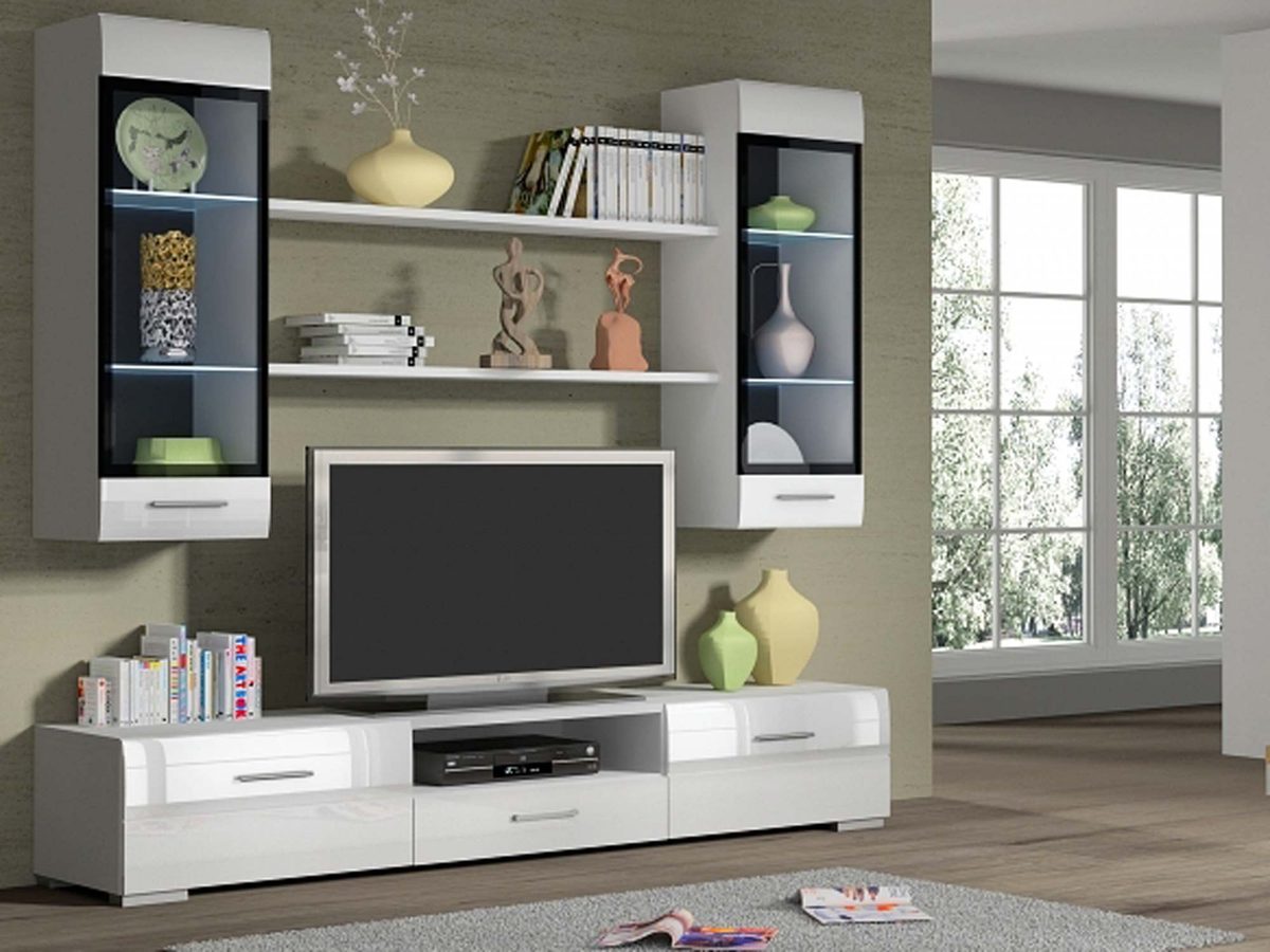 Co istotne, proponowana elegancka meblościanka do salonu świetnie wpasuje się w nowoczesne aranżacje. Ze względu na prostotę w bryle oraz wykończenie wysokim połyskiem, mebel z pewnością doda wnętrzu klasy oraz elegancji. Co więcej duża szafka RTV pozwala na zamontowanie dużego telewizora oraz stanowi dużą przestrzeń na wyeksponowanie rodzinnych pamiątek czy drobnych dekoracji. Dodatkowo dwie wiszące symetrycznie witryny pięknie wyeksponują szkło czy inne dekoracje, zaś dwie wiszące półki schować to, co niekoniecznie chcemy, aby było widoczne. Co więcej, meblościanka znakomicie zda test w małych pomieszczeniach, gdyż składa się ze wszystkich potrzebnych mebli w salonie. Bez wątpienia jedyne czego potrzeba do dopełnienia aranżacji byłaby wygodna sofa oraz stolik kawowy.