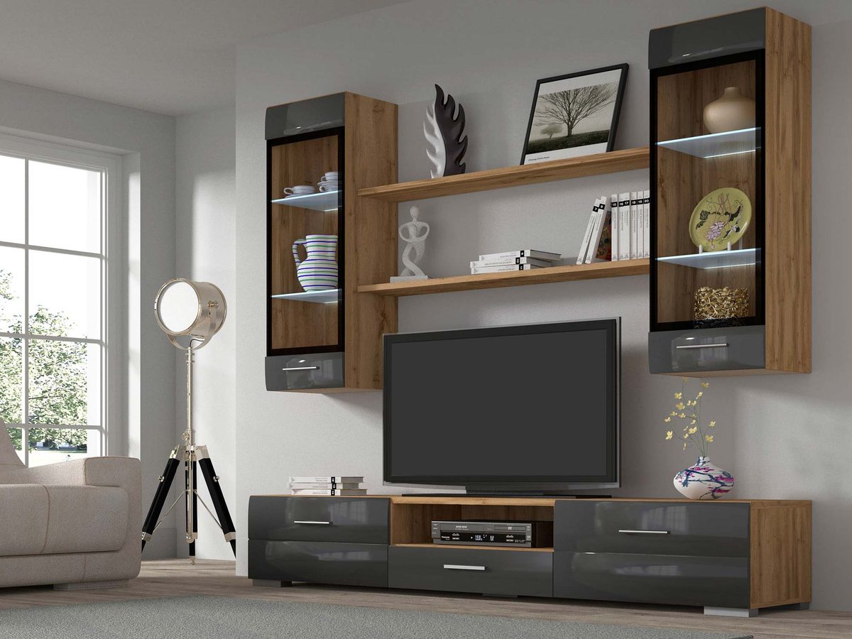 - Meblościanka zawiera: szafkę RTV, dwie przeszklone witryny wiszące, dwie półki.