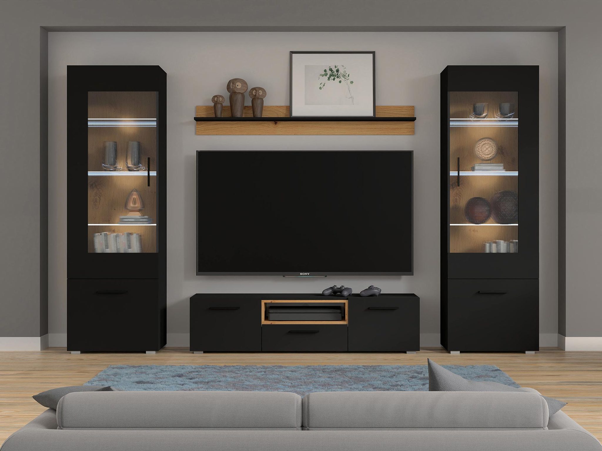 Klasyczna Meblościanka Nimet C Czarny Mat to idealne rozwiązanie dla tych, którzy cenią sobie nowoczesny design, funkcjonalność oraz wysoką jakość wykonania. Ten elegancki zestaw mebli do salonu, składający się z szafki RTV, półki oraz dwóch wysokich witryn, został zaprojektowany, aby nadać Twojemu wnętrzu wyjątkowy charakter i praktyczność. Dzięki modnemu kolorowi czarny mat / dąb artisan, meblościanka Nimet C wprowadza do wnętrza ciepło i nowoczesny akcent, który z pewnością przyciągnie wzrok.