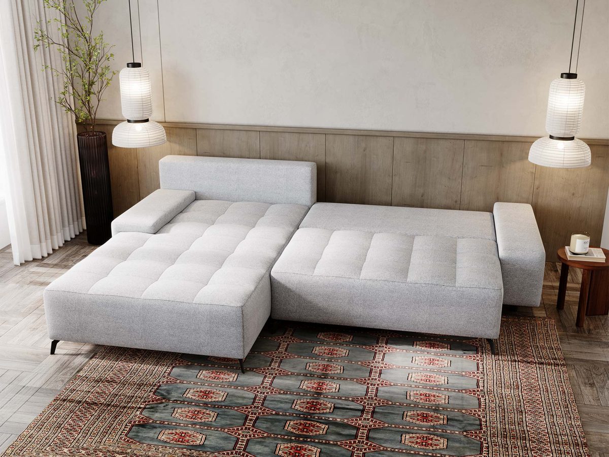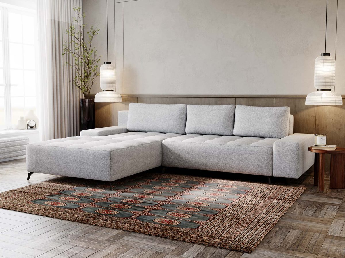 Sofa narożna z funkcją spania w aranżacji z dywanem orientalnym
